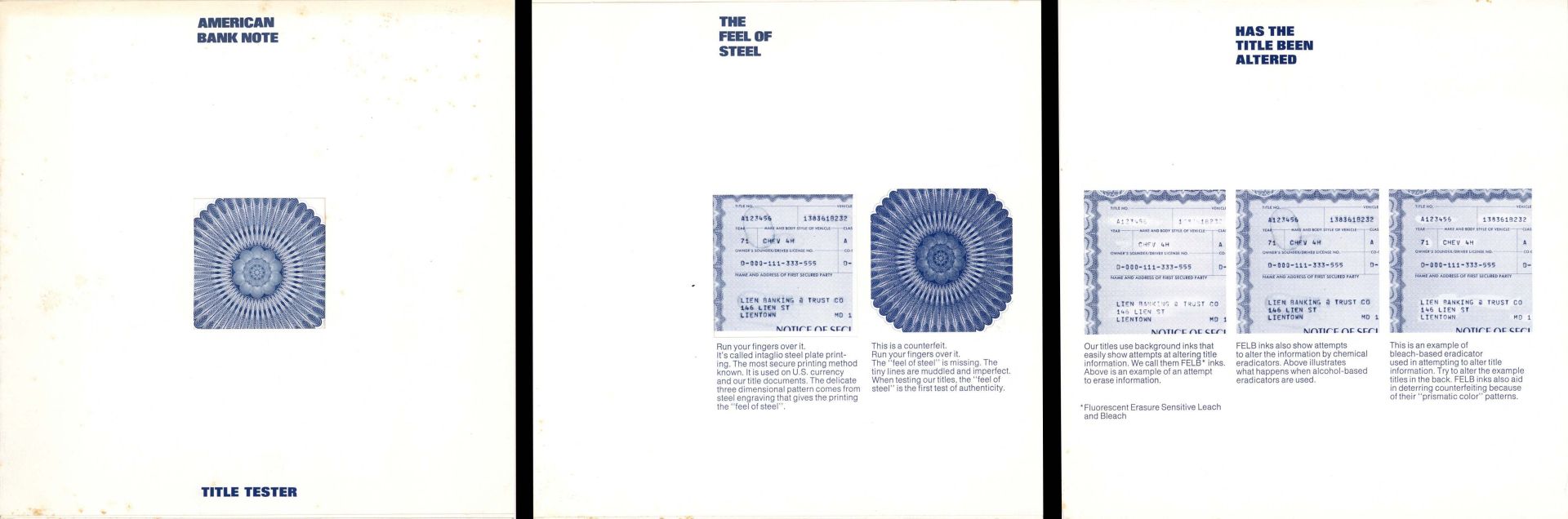 American Bank Note Company 4 times folding booklet which holds 6 different states Certificate Titles.