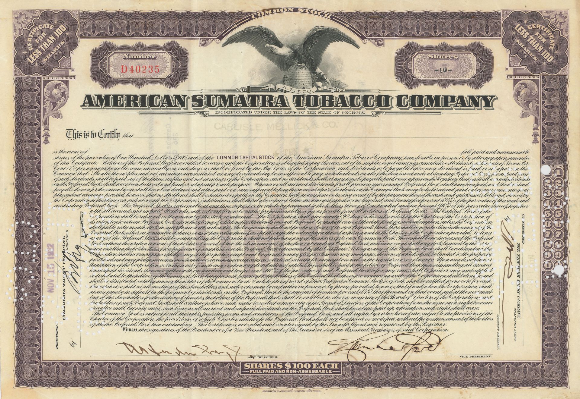 American Sumatra Tobacco Co. - 1920's-1930's dated Stock Certificate