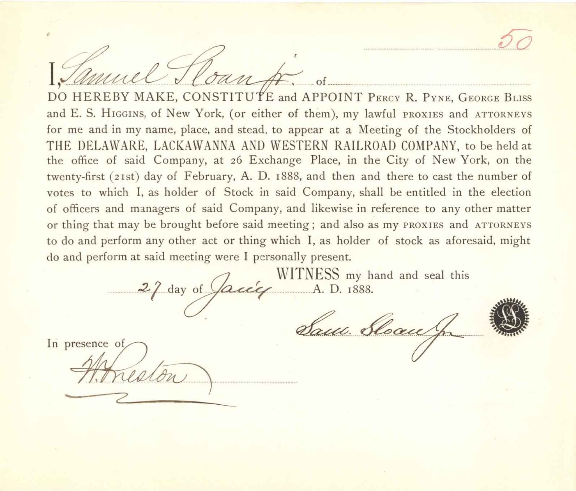 Appointment signed by Samuel Sloan Jr. - 1888 dated Autographs