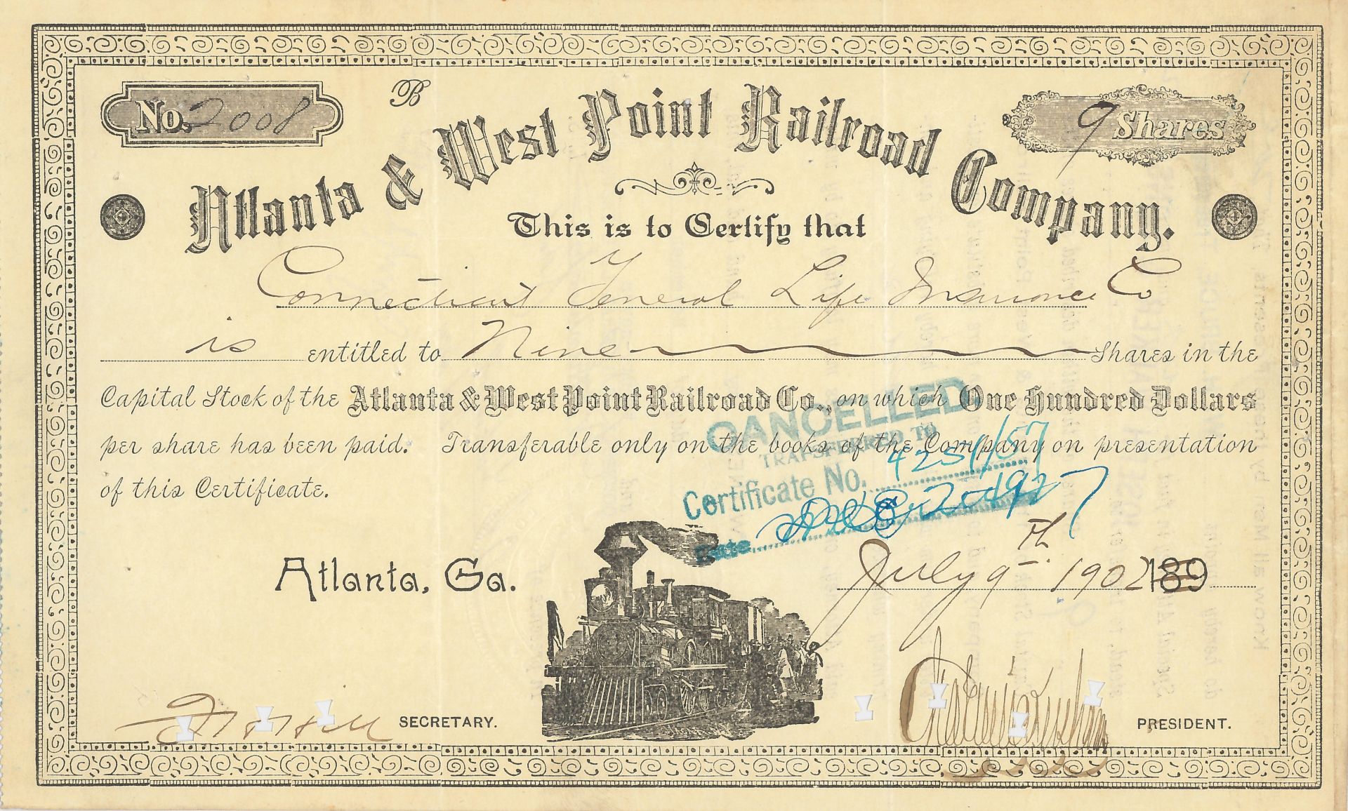 Atlanta and West Point Railroad Co. - 1896-1904 dated Stock Certificate
