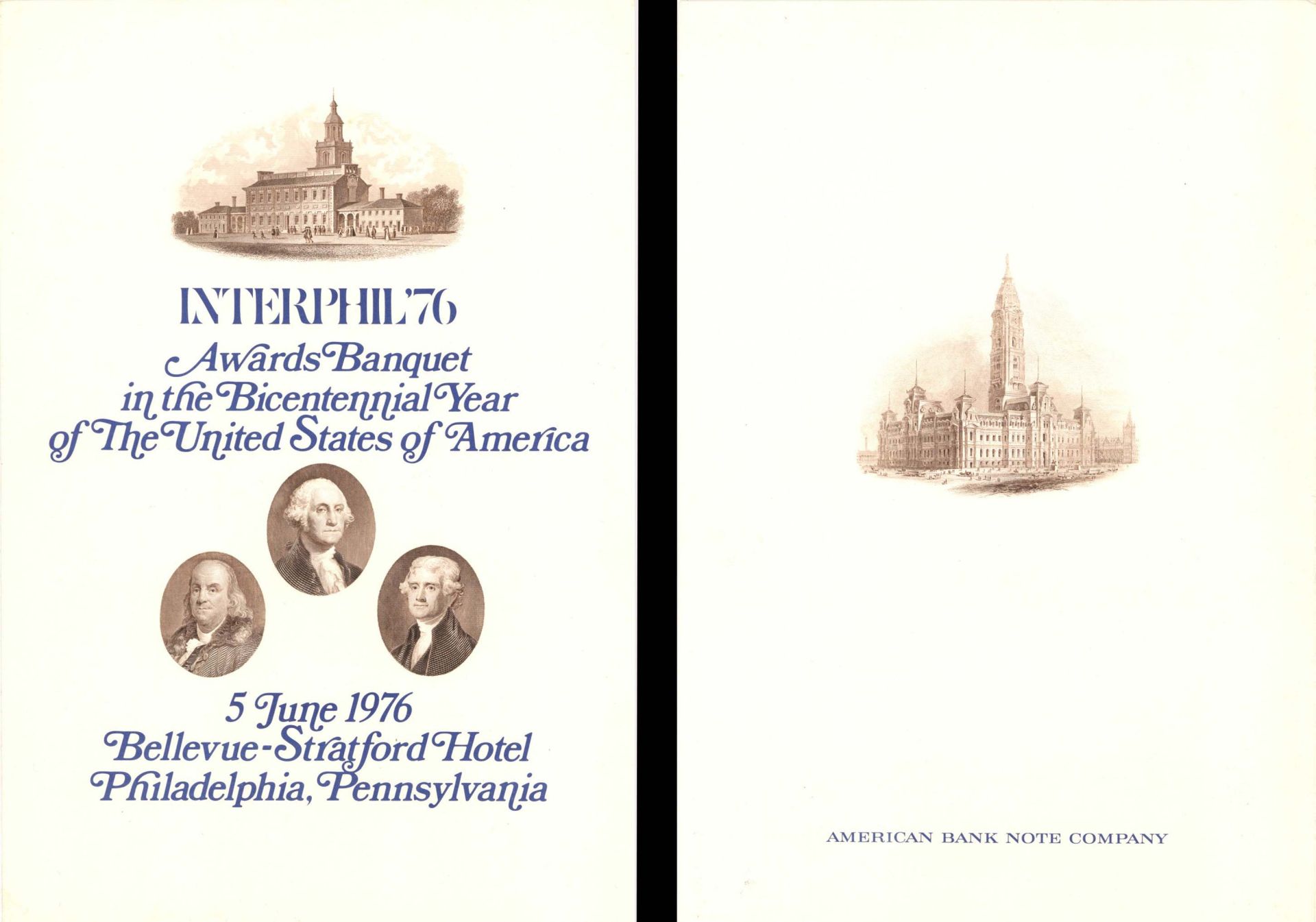 Interphil 76 Awards Banquet program and menu printed by American Bank Note Company. Front and back covers shown.