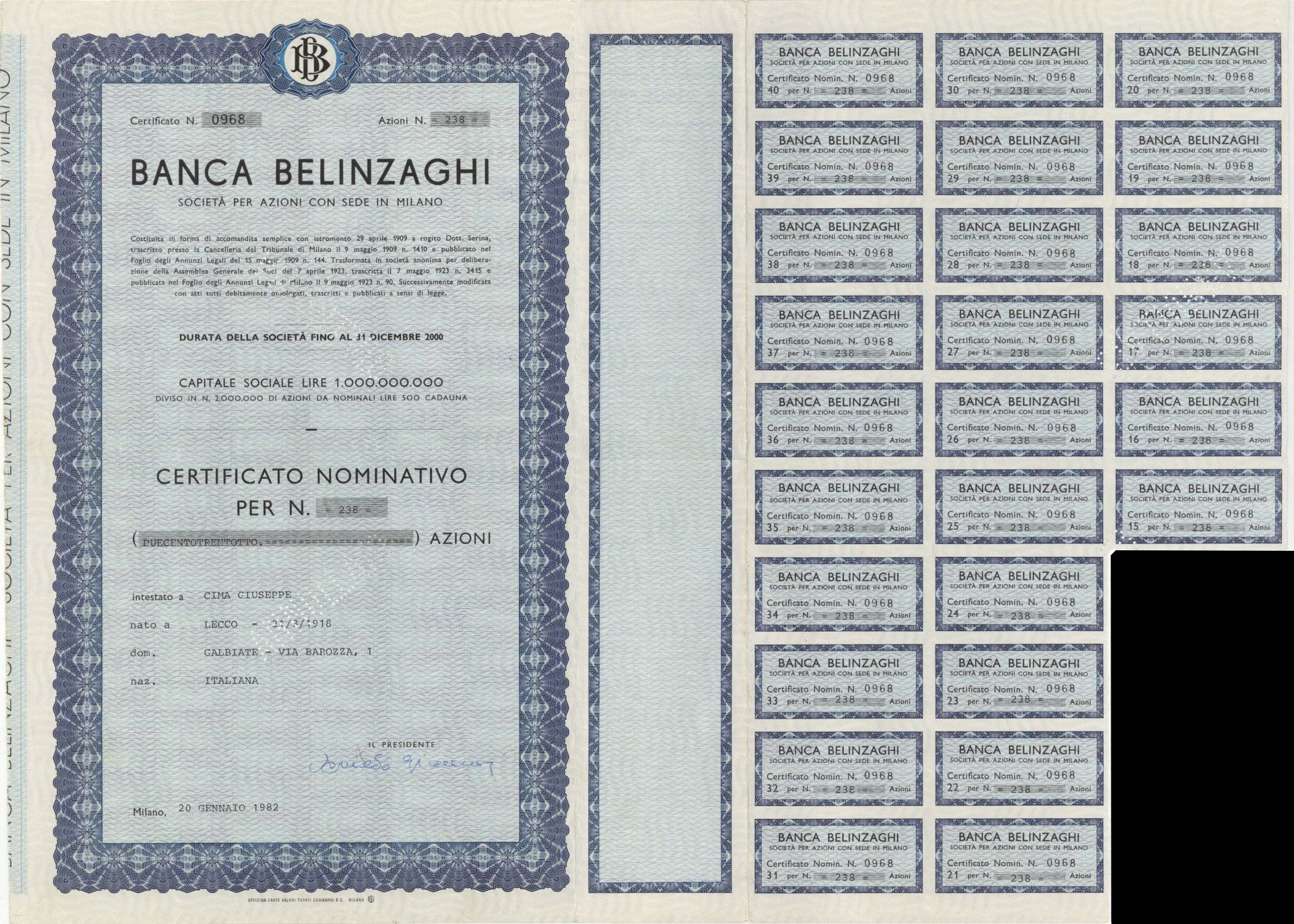 Banca Belinzaghi - 1982 dated Stock Certificate