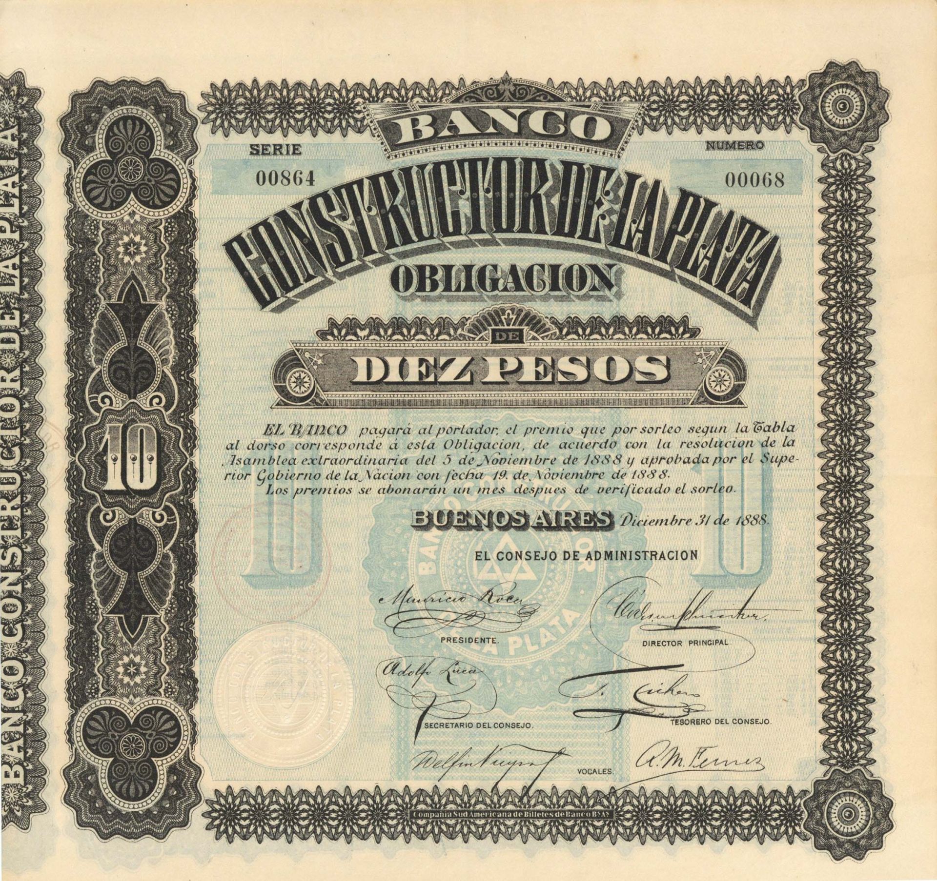 Banco Constructor De La Plata - 1888 dated Stock Certificate