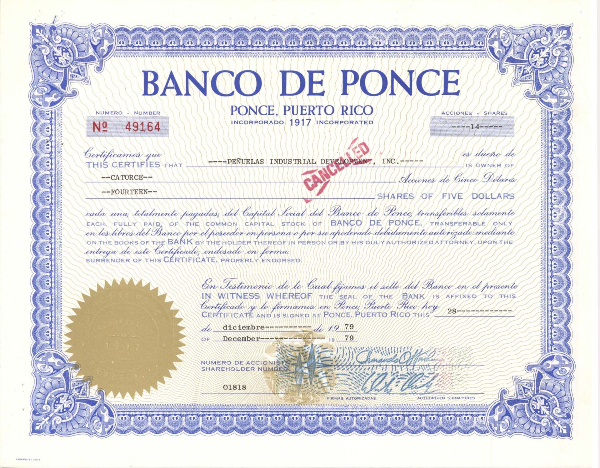 Banco De Ponce - 1979 dated Stock Certificate
