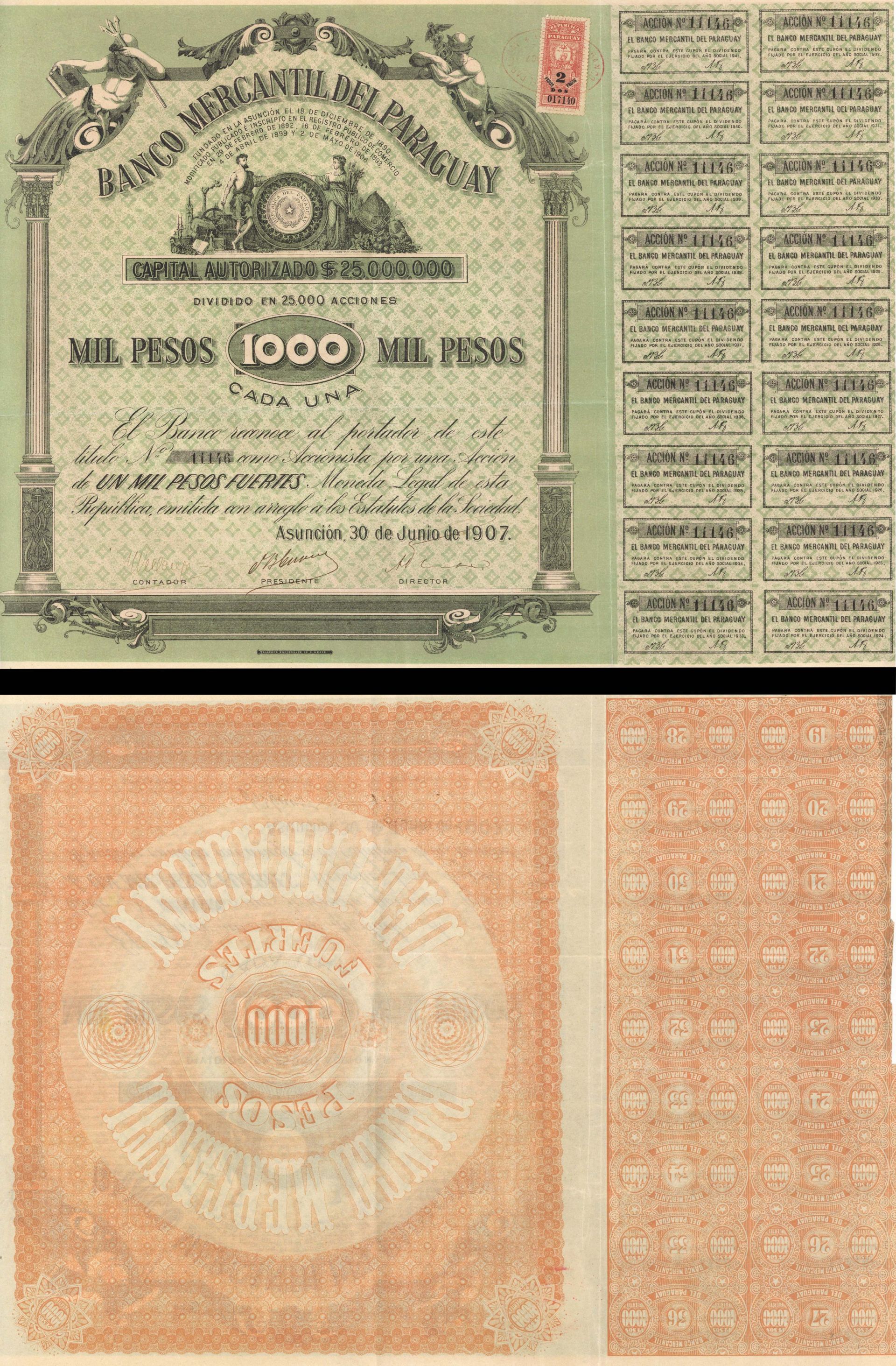 Banco Mercantil Del Paraguay - 1907 dated Stock Certificate