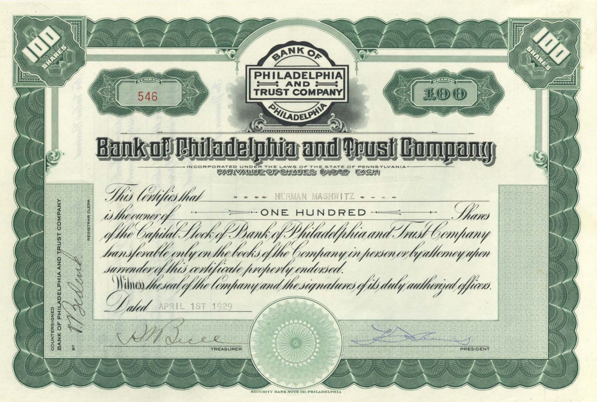 Bank of Philadelphia and Trust Co. - 1929 dated Stock Certificate