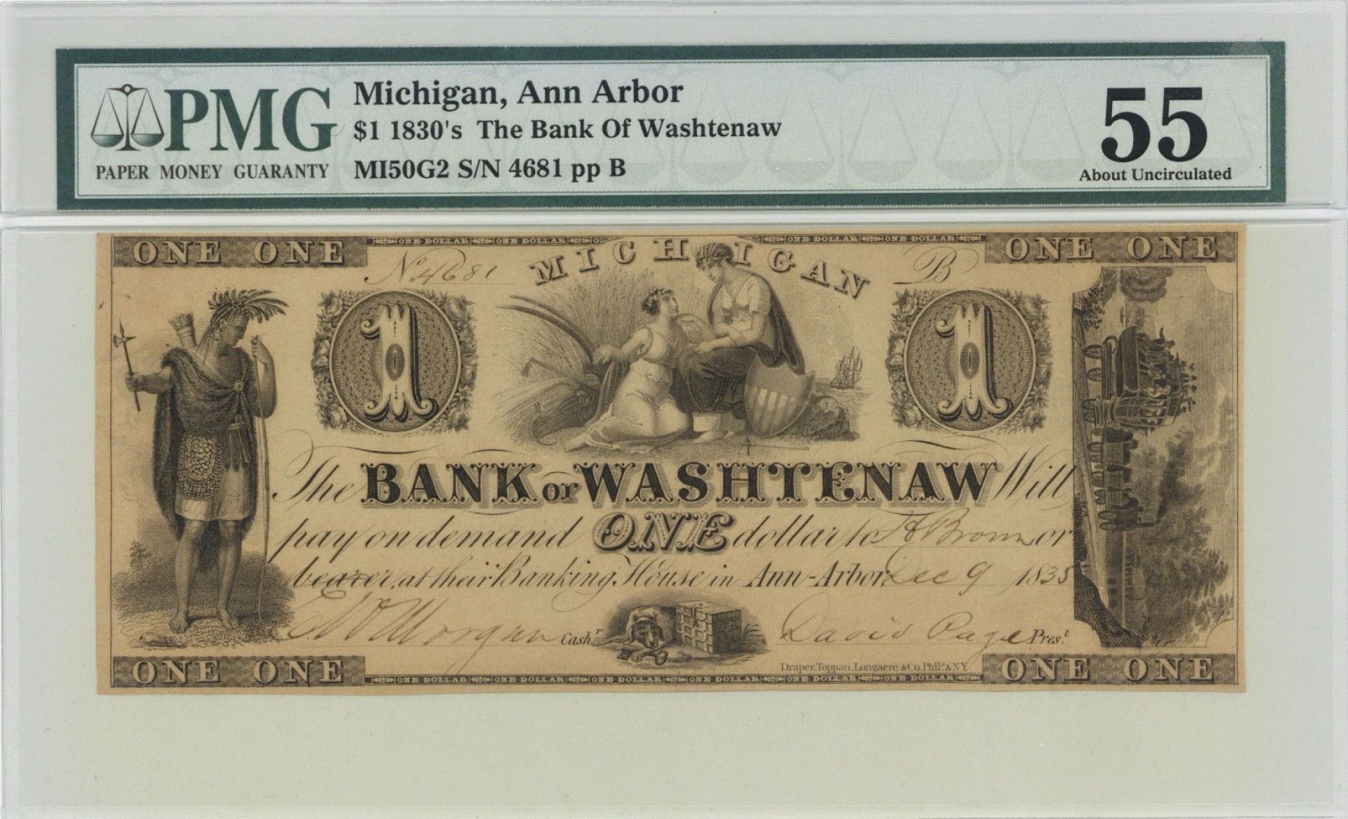 Inv# OB1546 Paper Money$1. Ann Arbor, Michigan. PMG #55 Graded. Washtenaw County is a county located in the U.S. state of Michigan. At the 2020 census, the population was 372,258. The county seat and largest city is Ann Arbor. The county was authorized by legislation in 1822 and organized as a county in 1826. Washtenaw County comprises the Ann Arbor Metropolitan Statistical Area. The county is home to the University of Michigan, Eastern Michigan University, Washtenaw Community College, and Concordia University Ann Arbor. Read more at https://en.wikipedia.org/wiki/Washtenaw_County,_Michigan