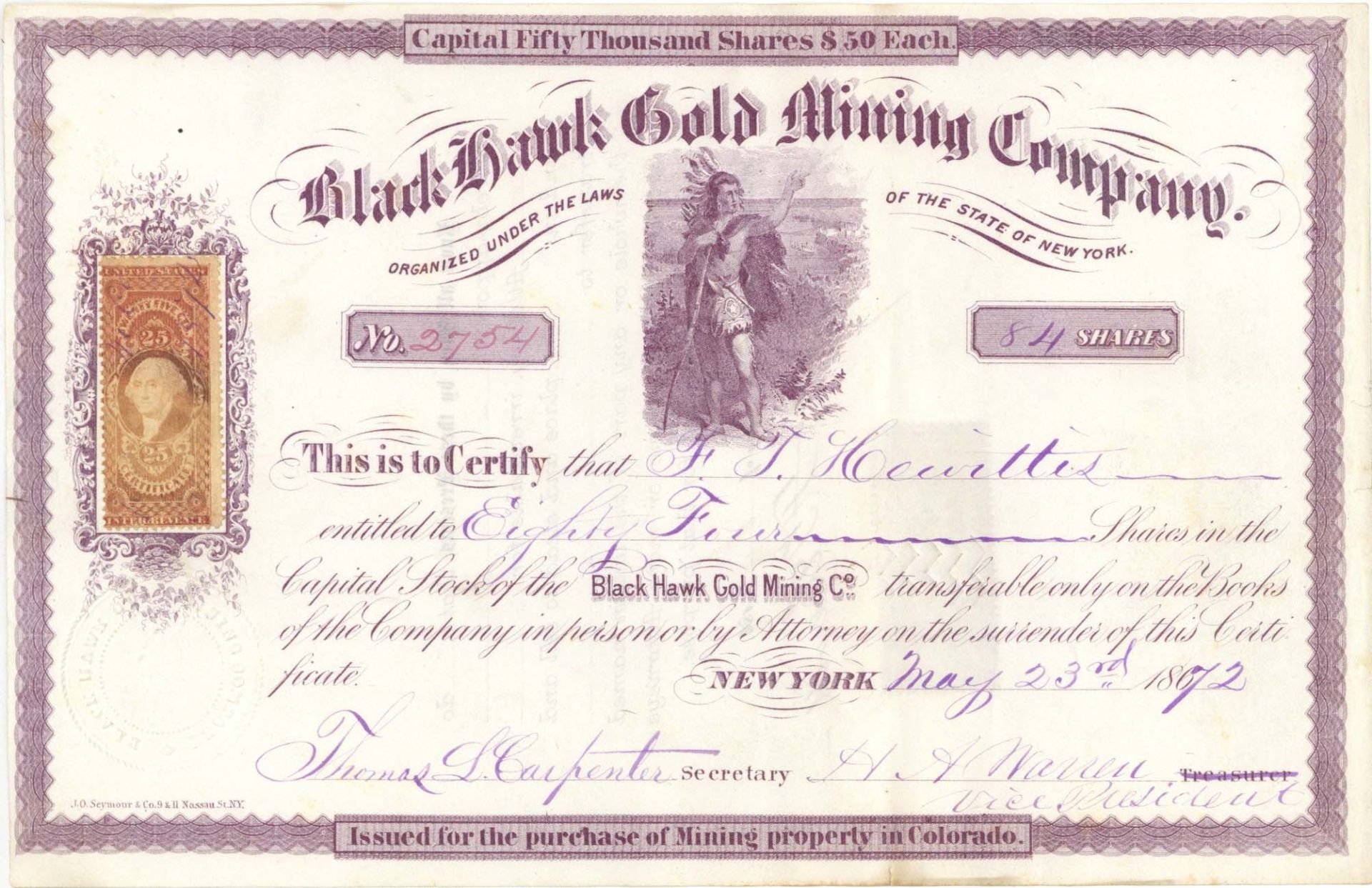 Stock printed by J.D. Seymour & Co., N.Y. with great Indian vignette and 25 cents Washington revenue stamp!