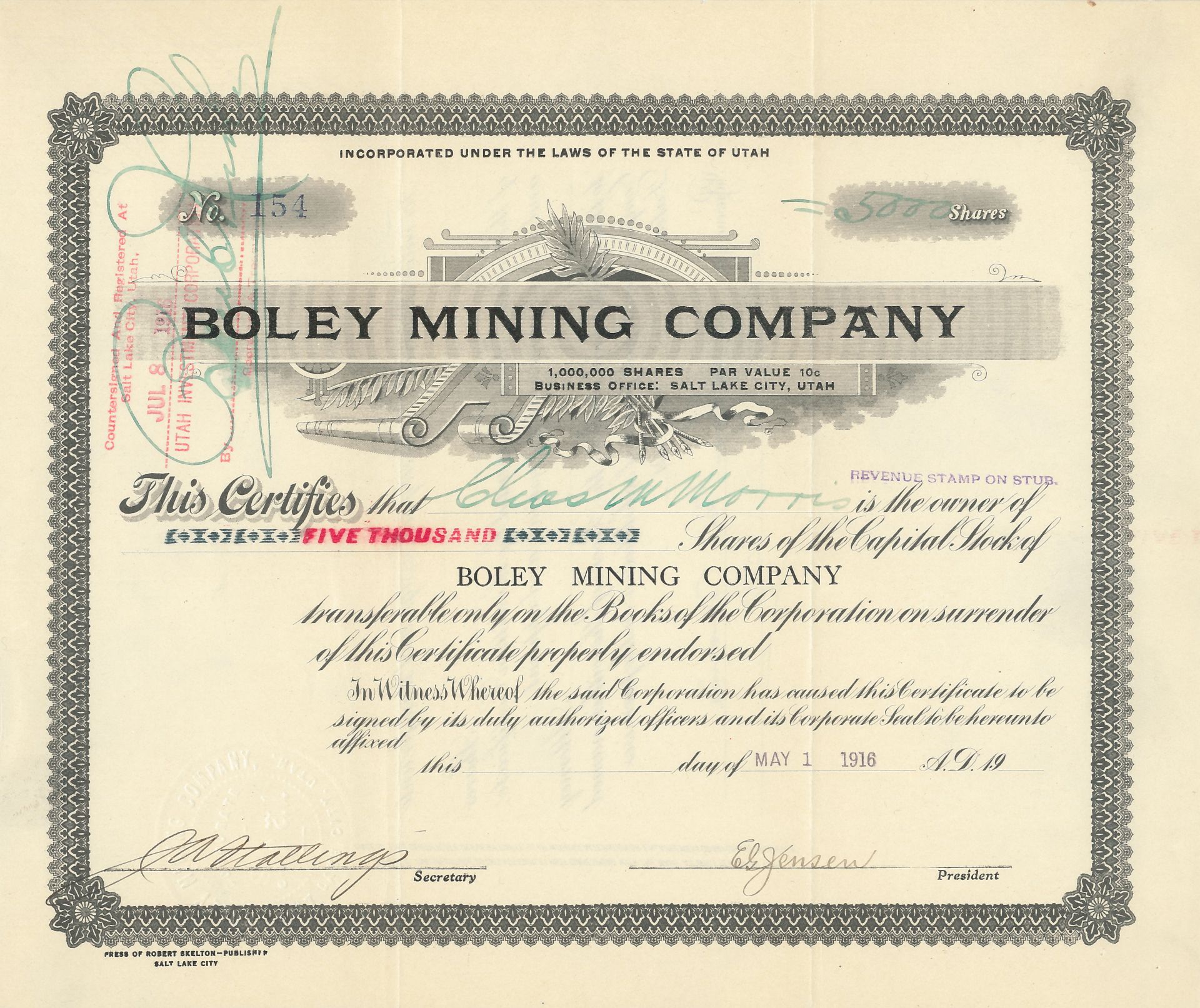 Stock printed by Press of Robert Skelton, Salt Lake City. Mines: American Fork Dist. Utah Co., UT.