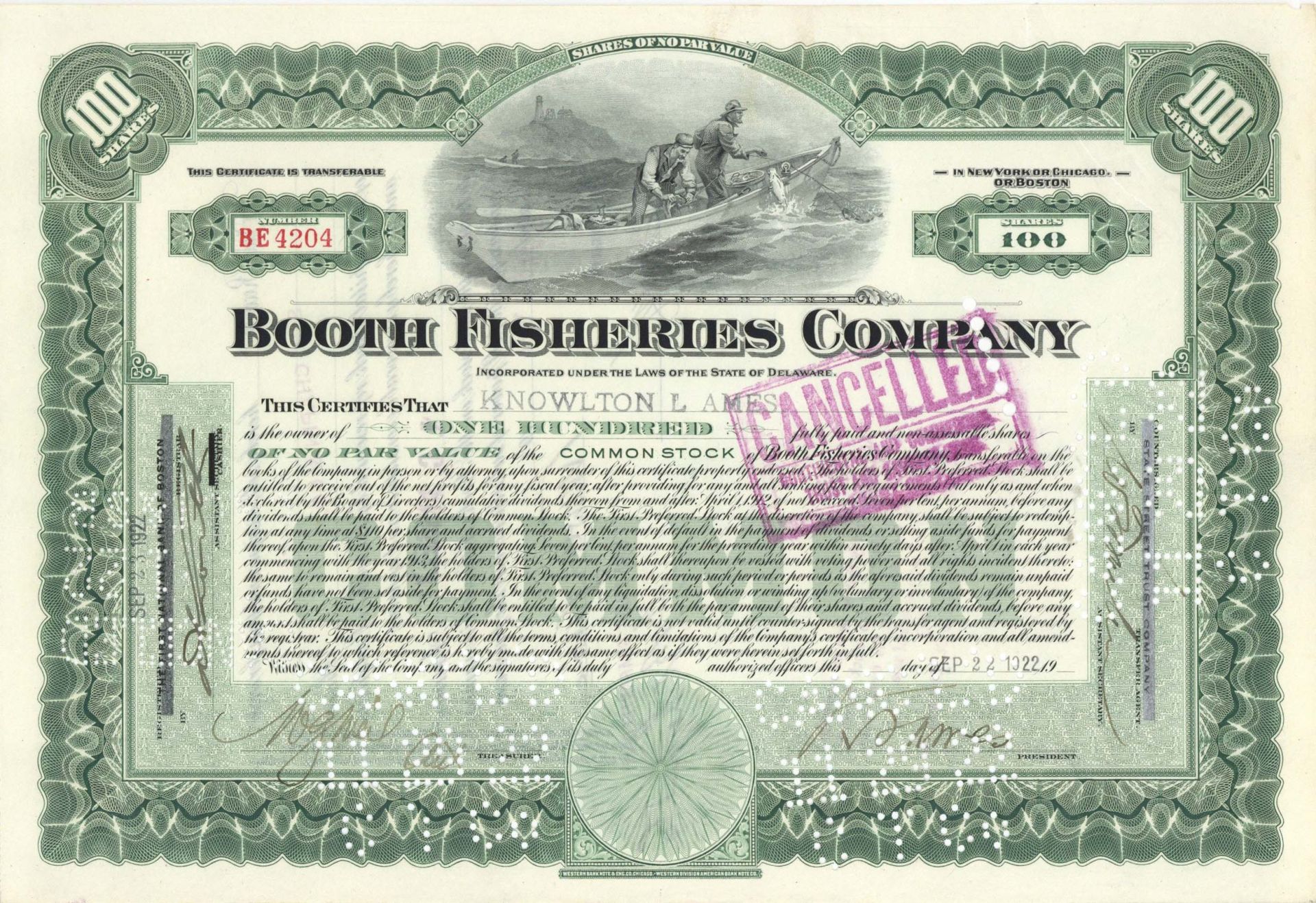Booth Fisheries Co. - 1922 dated Stock Certificate