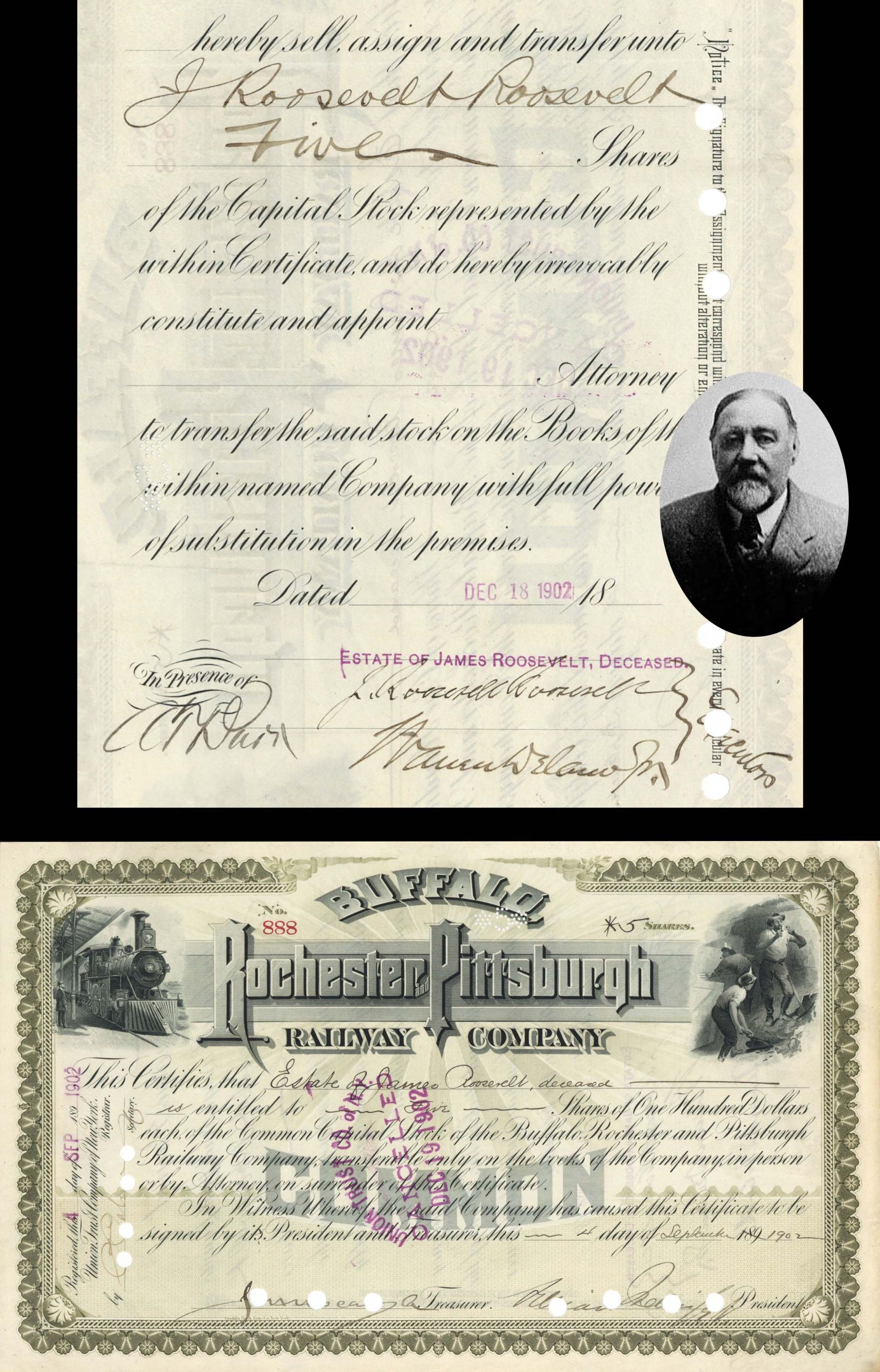 Buffalo, Rochester and Pittsburgh Railway Co. signed by James Roosevelt - 1902 dated Autographed Stock Certificate