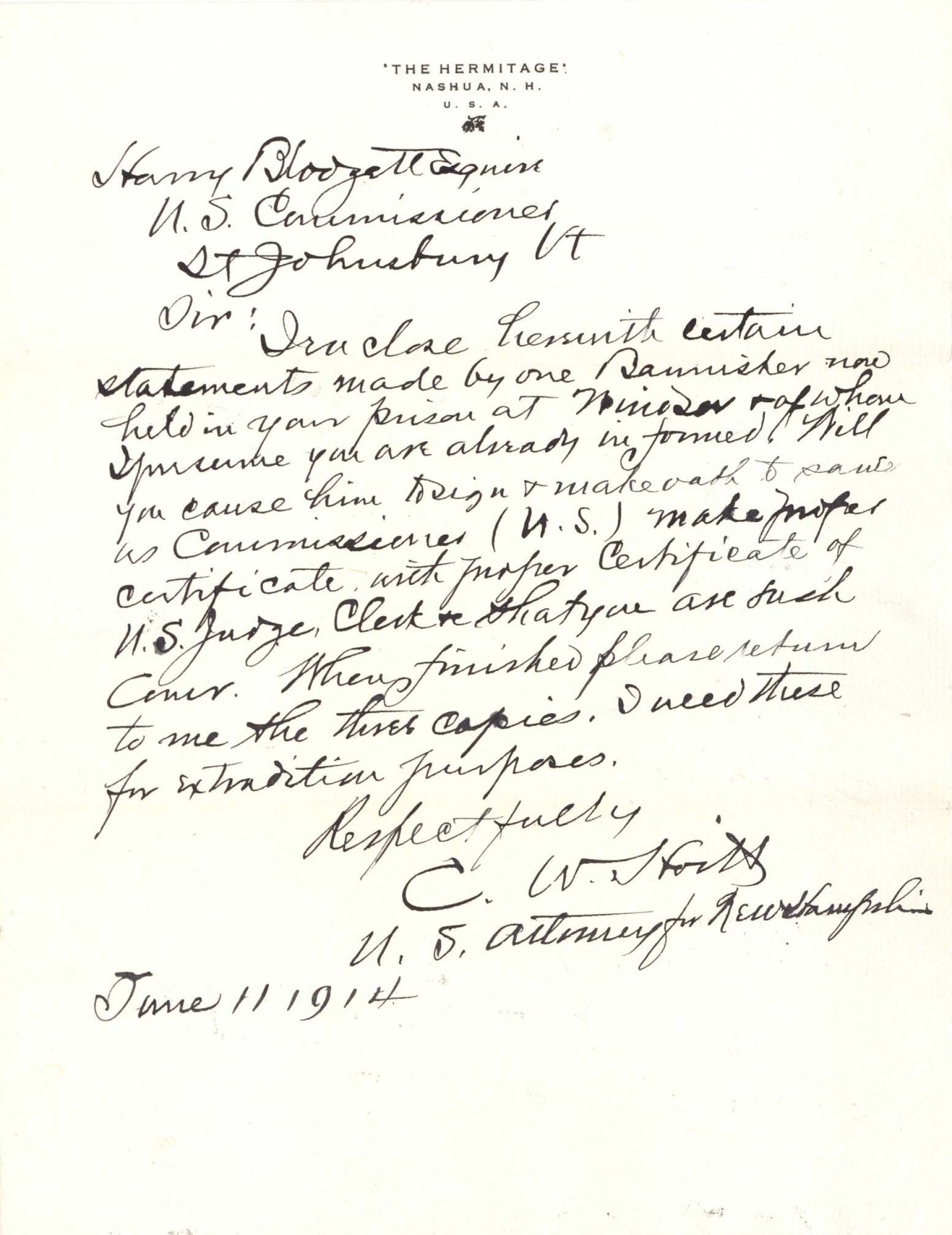Handwritten letter signed by C.W. Hoitt, U.S. Attorney in New Hampshire to Harry Blodgett, Esquire in St. Johnsbury, Vermont.