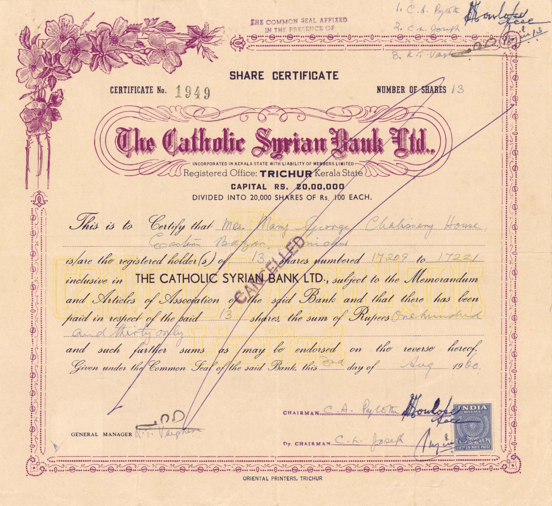 Catholic Syrian Bank Ltd. - 1960 dated Stock Certificate