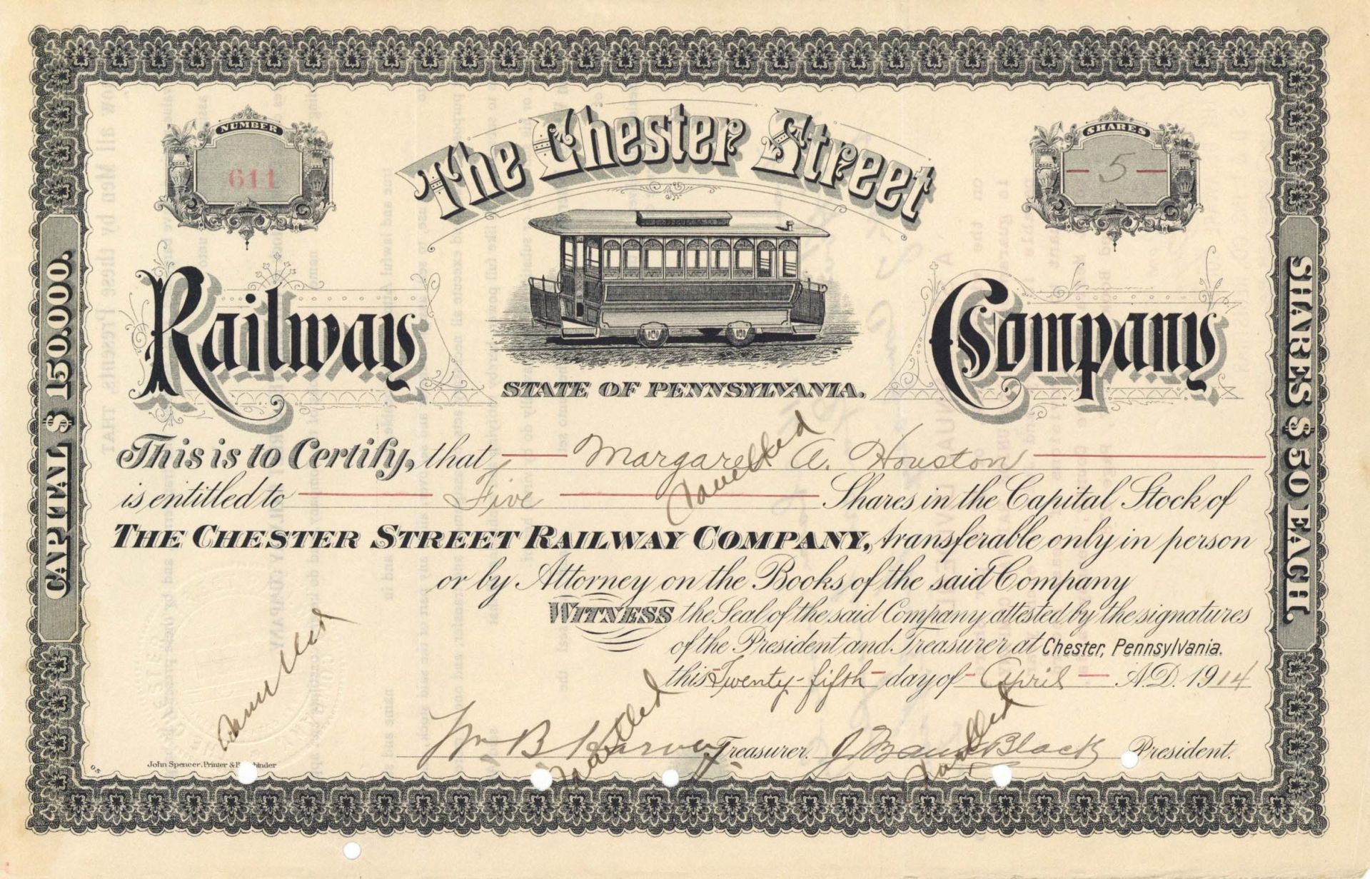 Chester Street Railway Co. - 1914 dated Stock Certificate