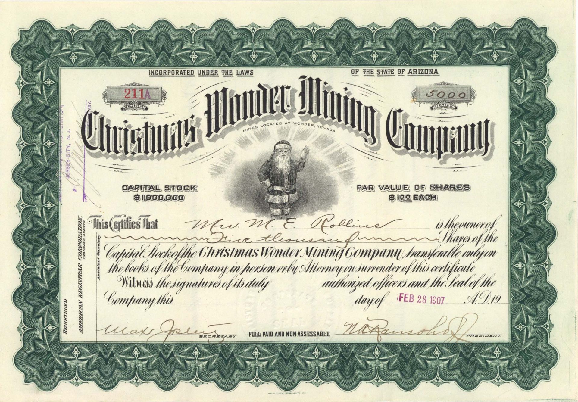 Christmas Wonder Mining Co. - 1907 dated Stock Certificate