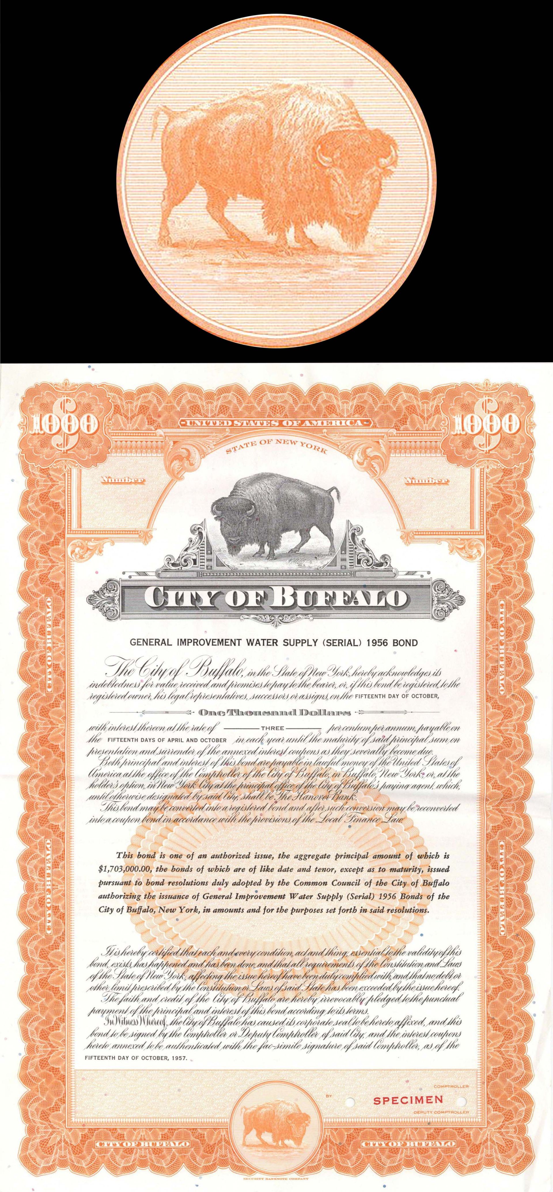 $1,000 Specimen Bond printed by Security Banknote Company. Full page of coupons remain. General Improvement Water Supply Bond. Buffalo vignette at top and bottom!