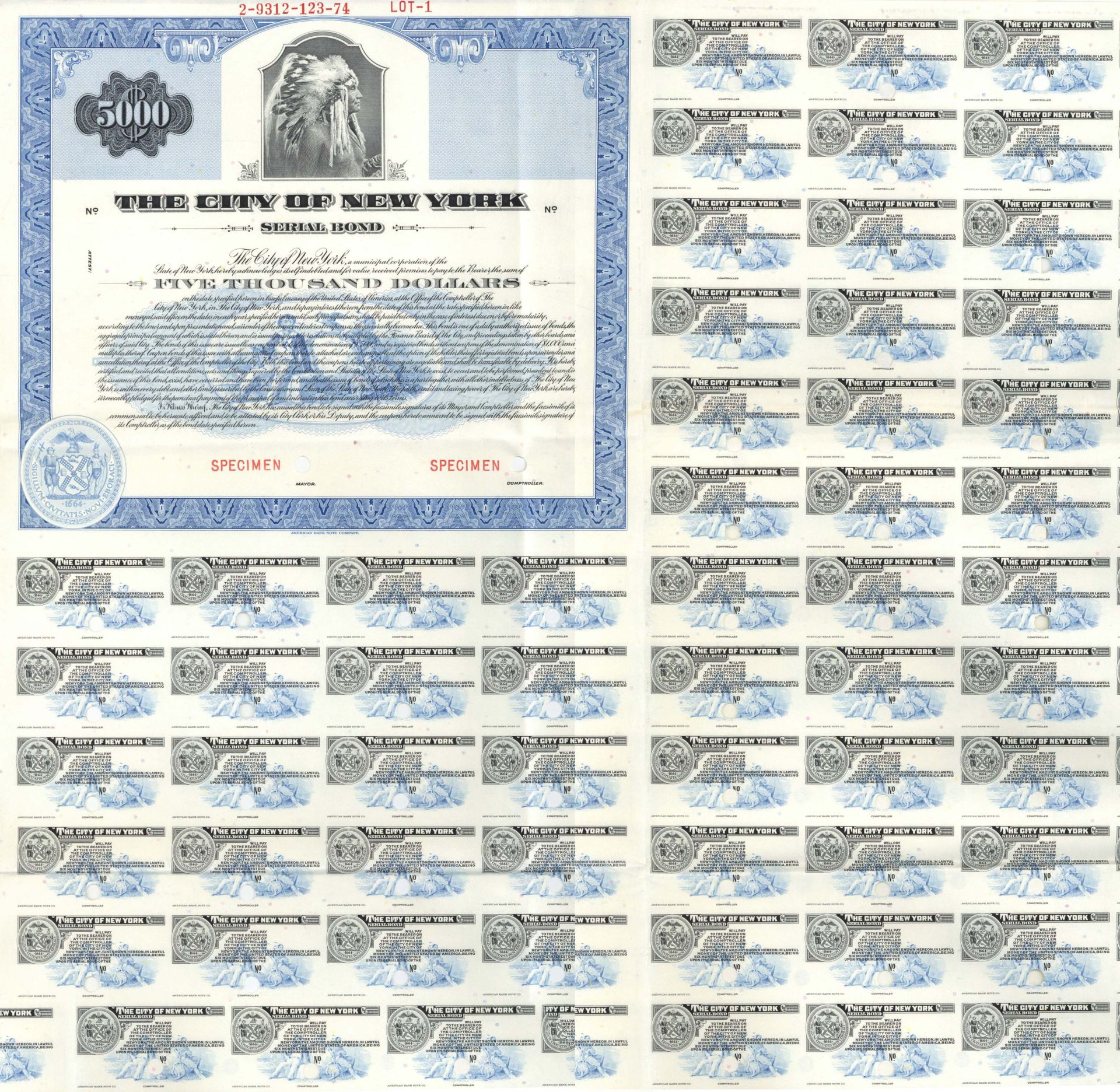 Inv# SE1686 Bond$5,000 Specimen Bond printed by American Bank Note Company. 56 coupons at right and 32 coupons at bottom of bond.