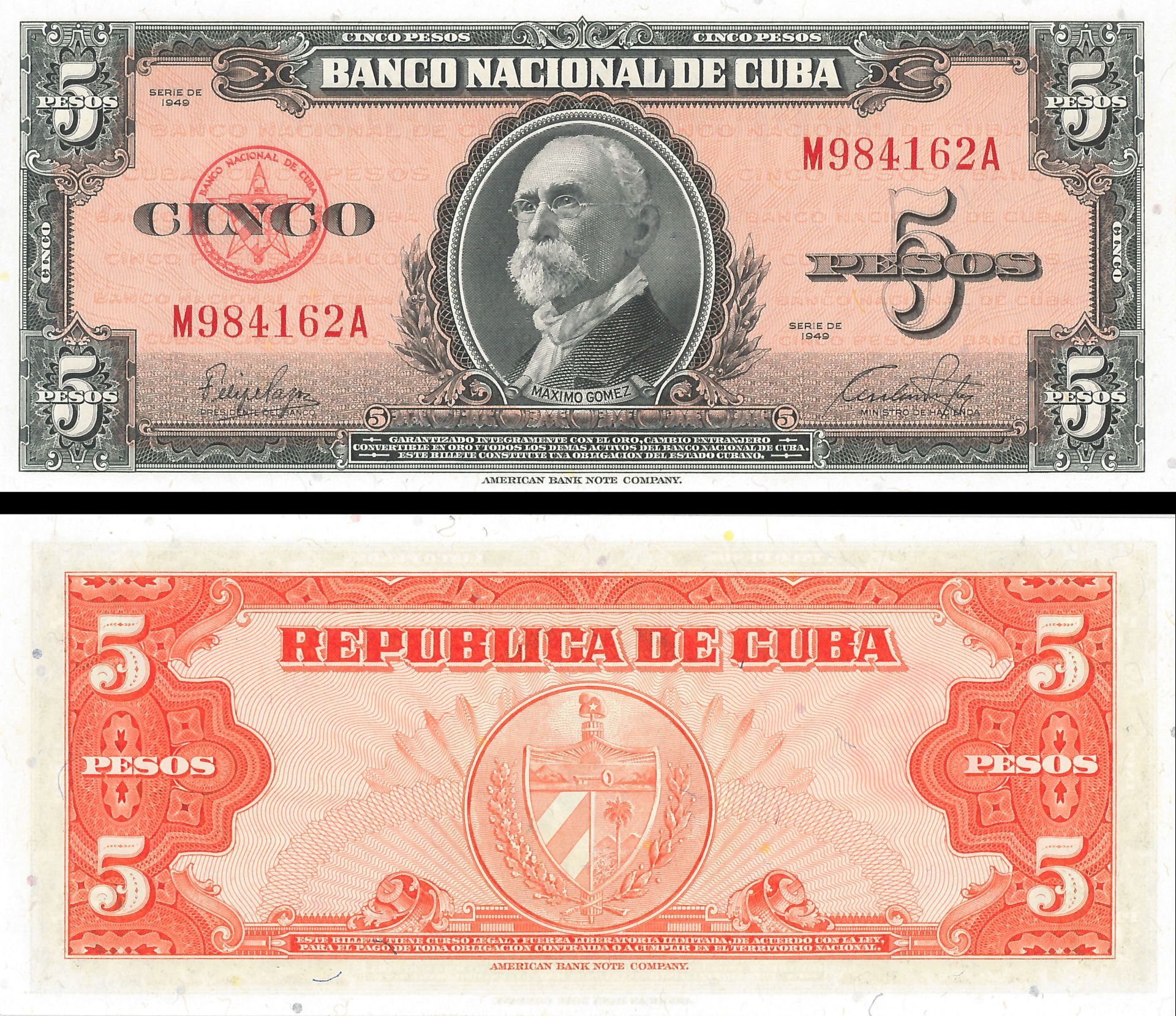 5 Pesos, P-78a. The Cuban peso (in Spanish peso cubano, ISO 4217 code: CUP) also known as moneda nacional, is the official currency of Cuba. The Cuban peso historically circulated at par with the Spanish-American silver dollar from the 16th to 19th centuries, and then at par with the U.S. dollar from 1881 to 1959. The Castro government then introduced the socialist planned economy and pegged the peso to the Soviet ruble.