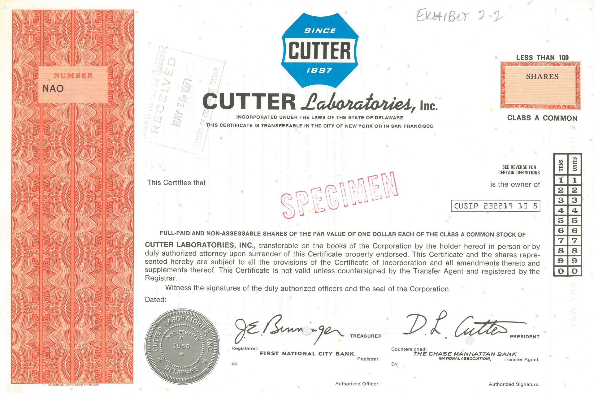 Cutter Laboratories, Inc. - Specimen Stock Certificate