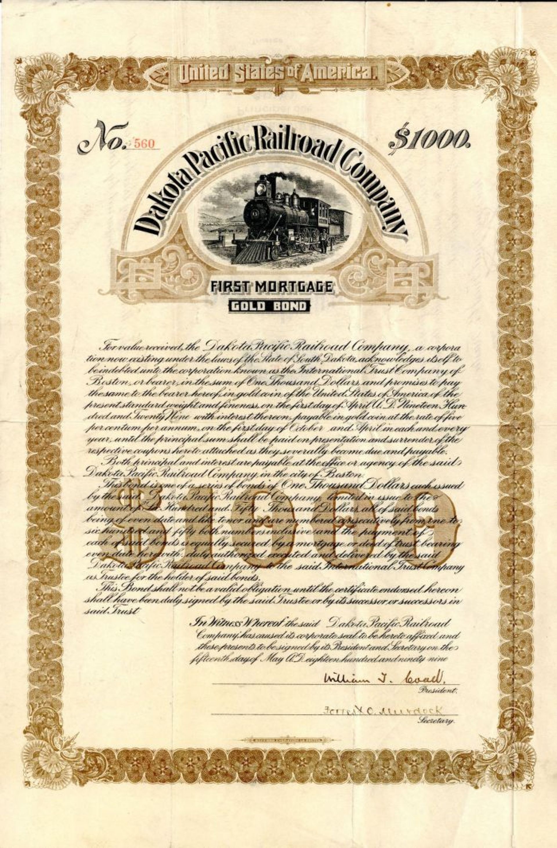 Dakota Pacific Railroad Co. - $1,000 Railway First Mortgage Gold Bond