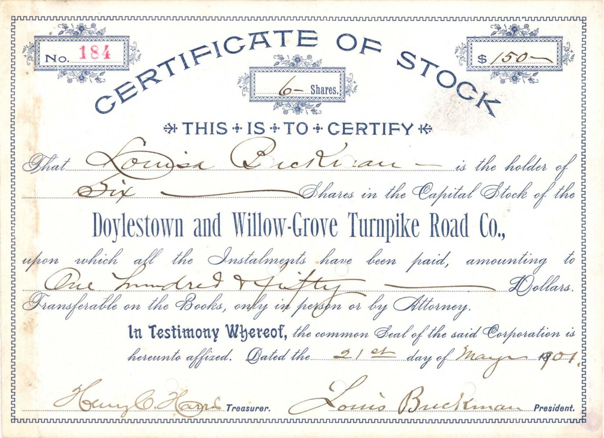 Doylestown and Willow-Grove Turnpike Road Co. - 1901 dated Stock Certificate
