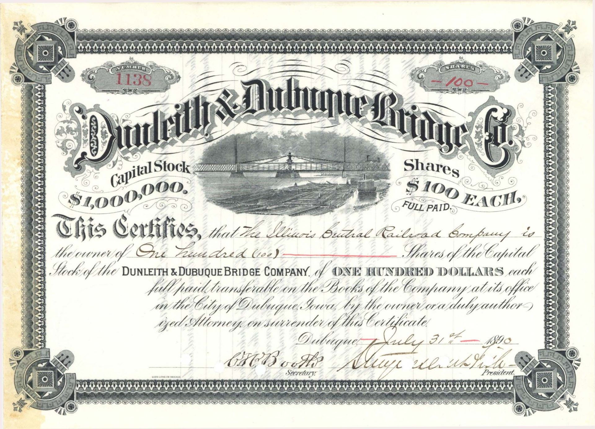 Dunleith and Dubuque Bridge Co. - 1890 dated Stock Certificate