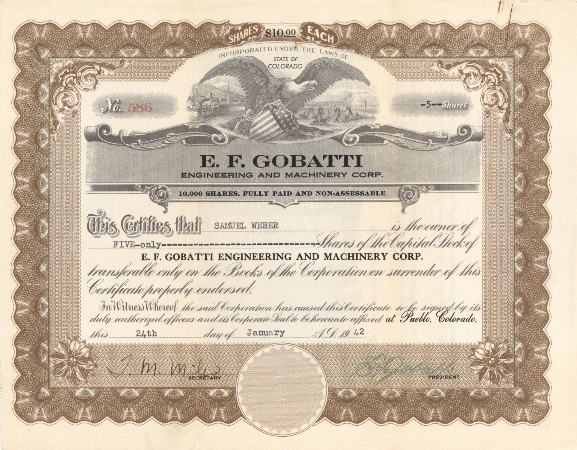 E.F. Gobatti - 1942 dated Stock Certificate