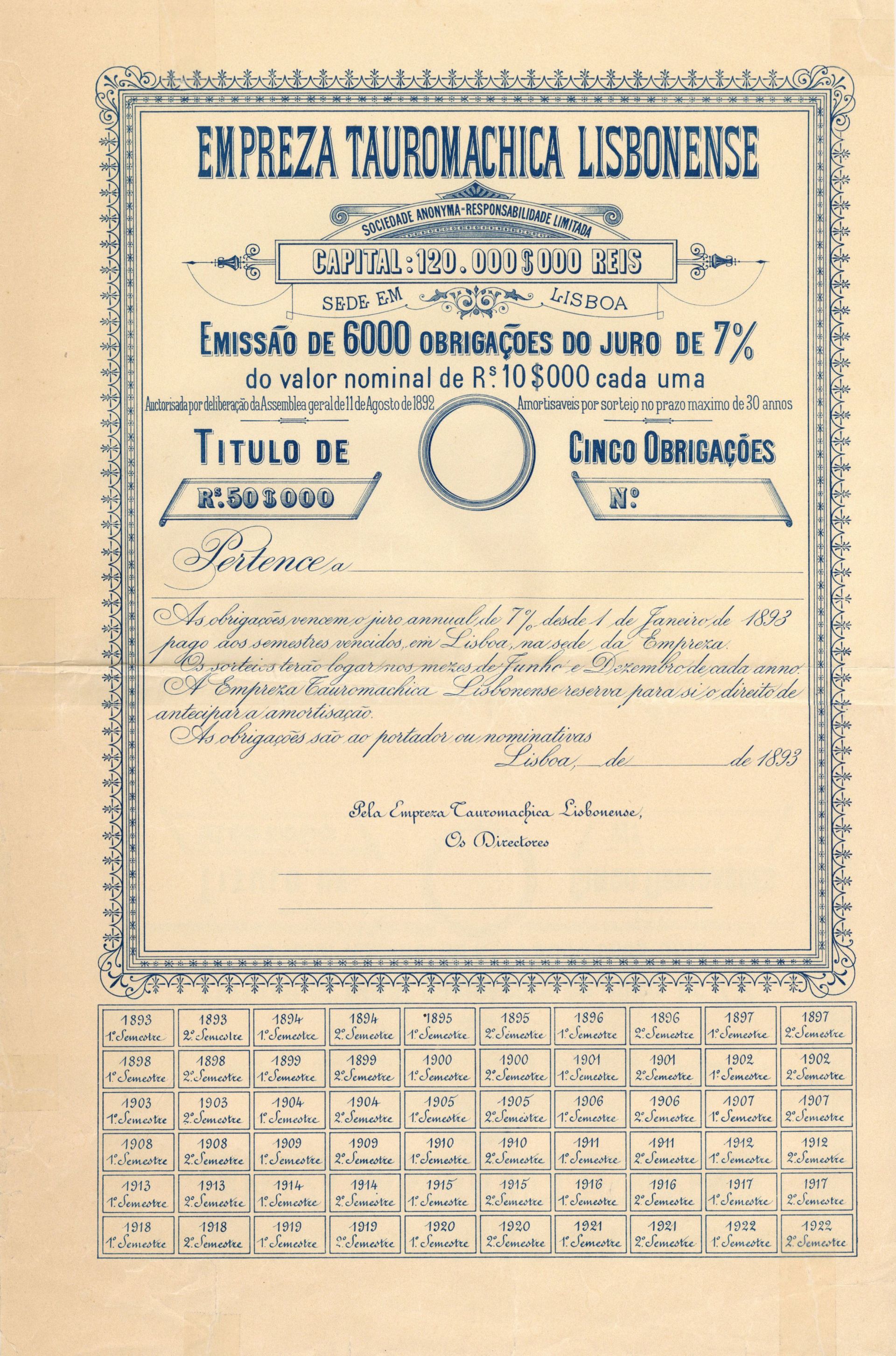 Empreza Tauromachica Lisbonense - 1893 dated Foreign Bonds