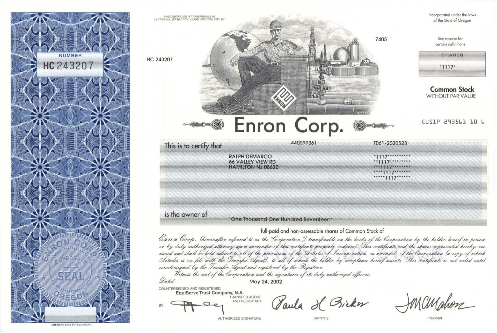 Enron Corporation - Crooked E Vignette - 2002 dated Stock Certificate - Famous Fraudulent Company