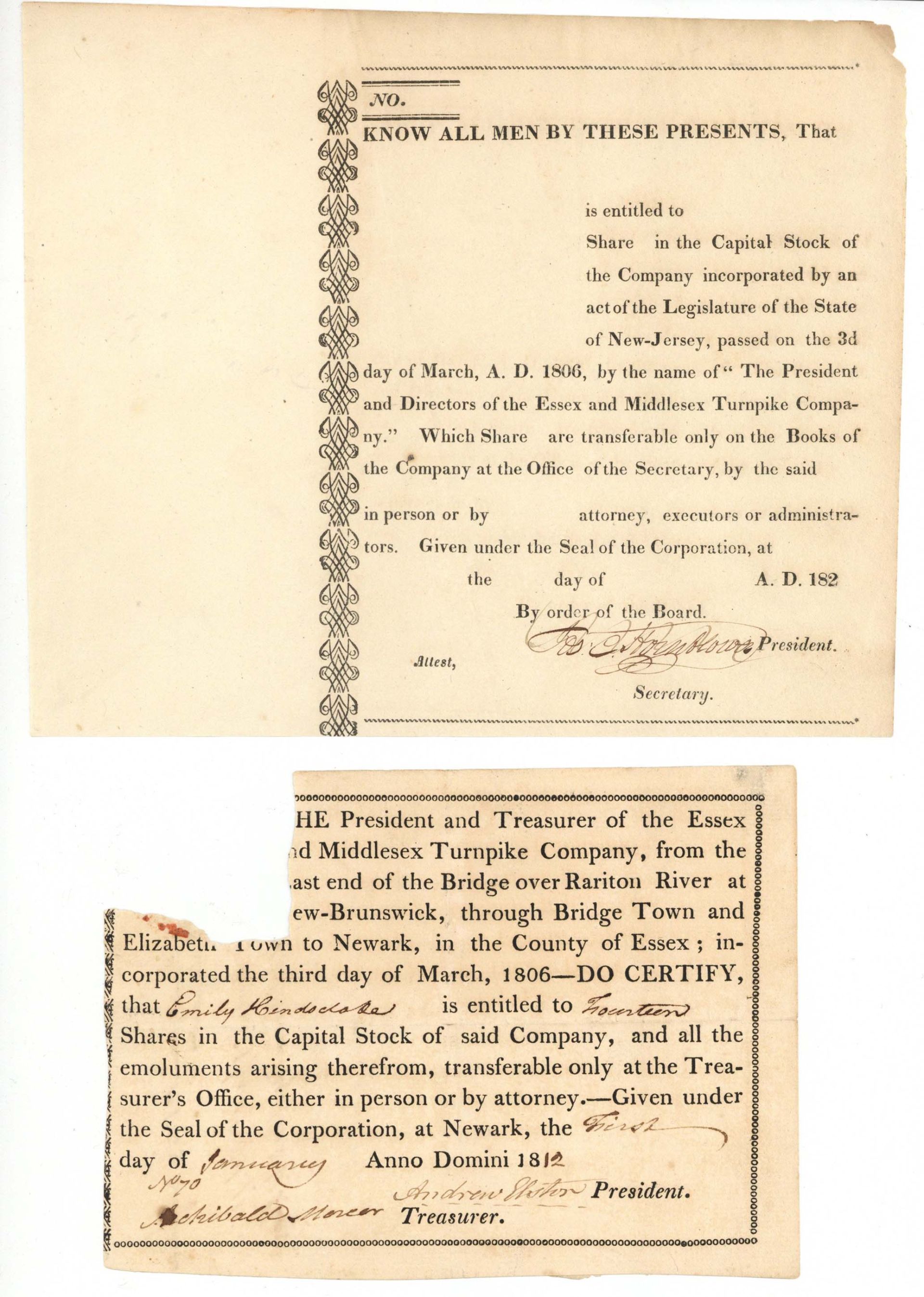 new Essex and Middlesex Turnpike Co. - Unissued and 1812 dated Stock Certificates