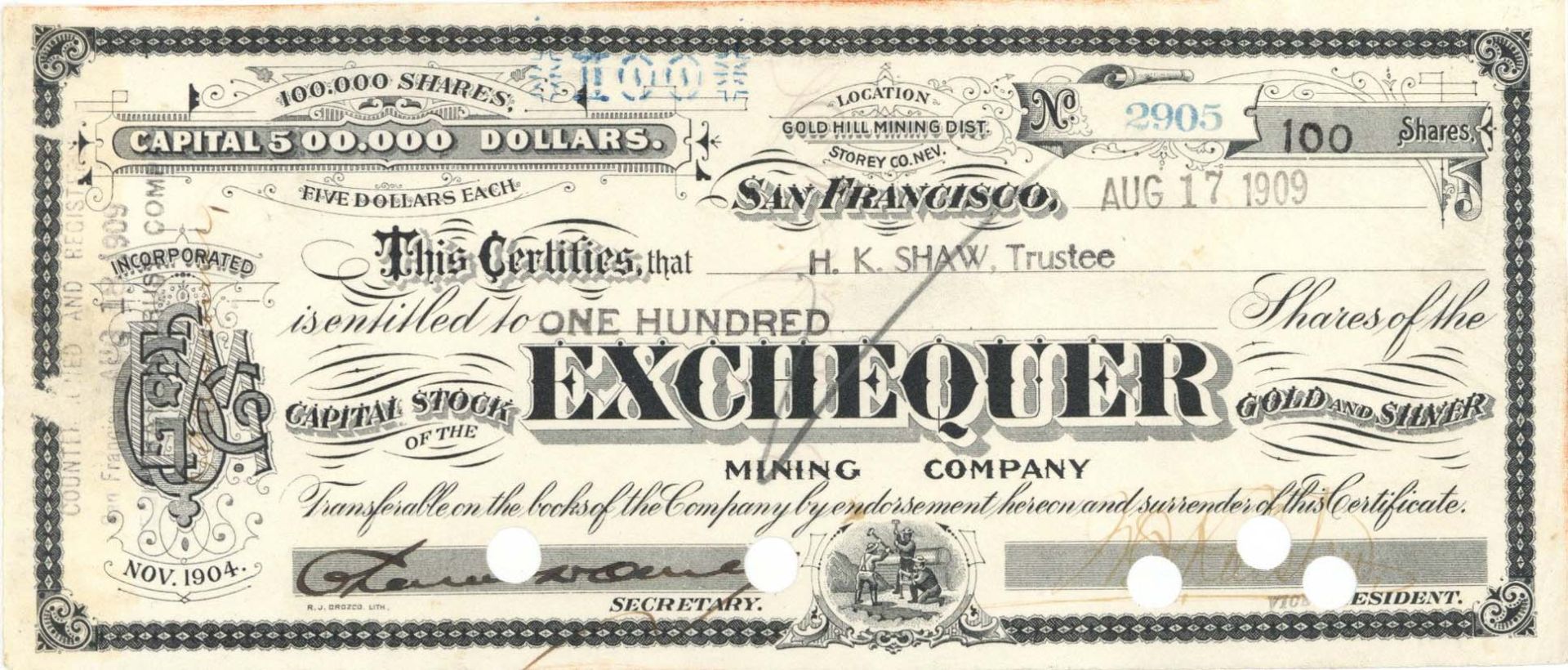 Exchequer Mining Co. - 1909 dated Stock Certificate