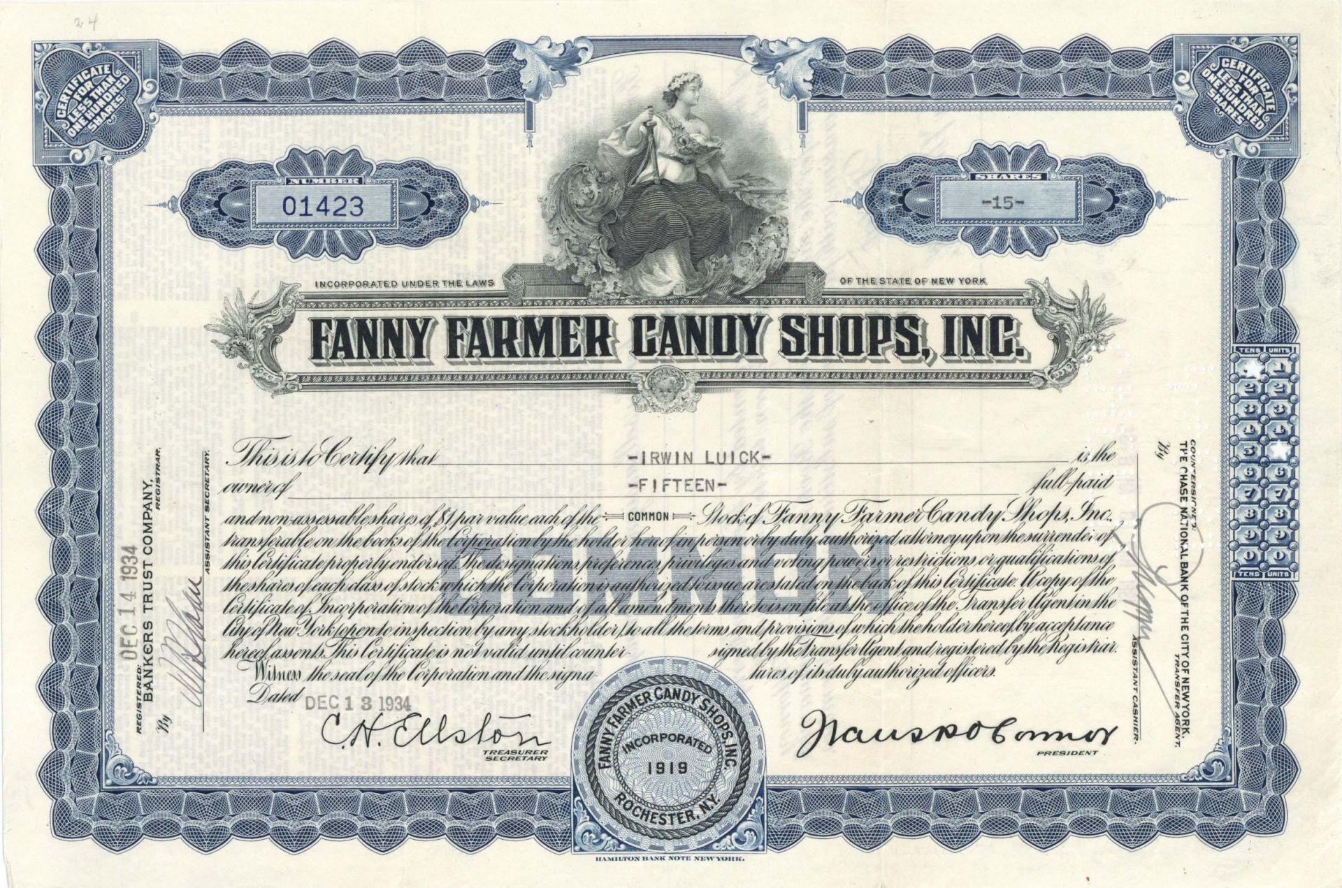 Fanny Farmer Candy Shops, Inc. - 1934 dated Stock Certificate