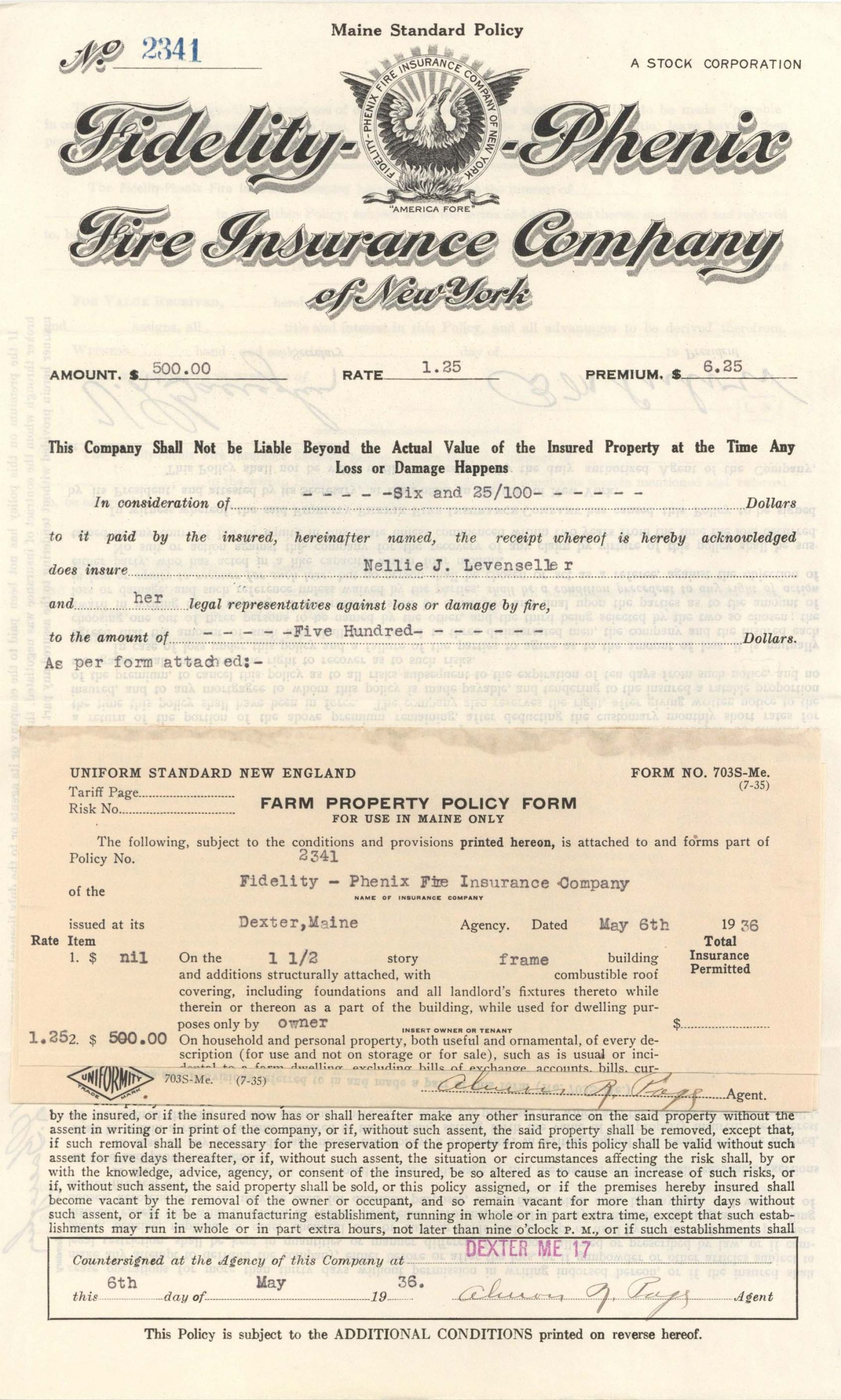 Fidelity-Phenix Fire Insurance Co. Policy - 1936 dated Insurance