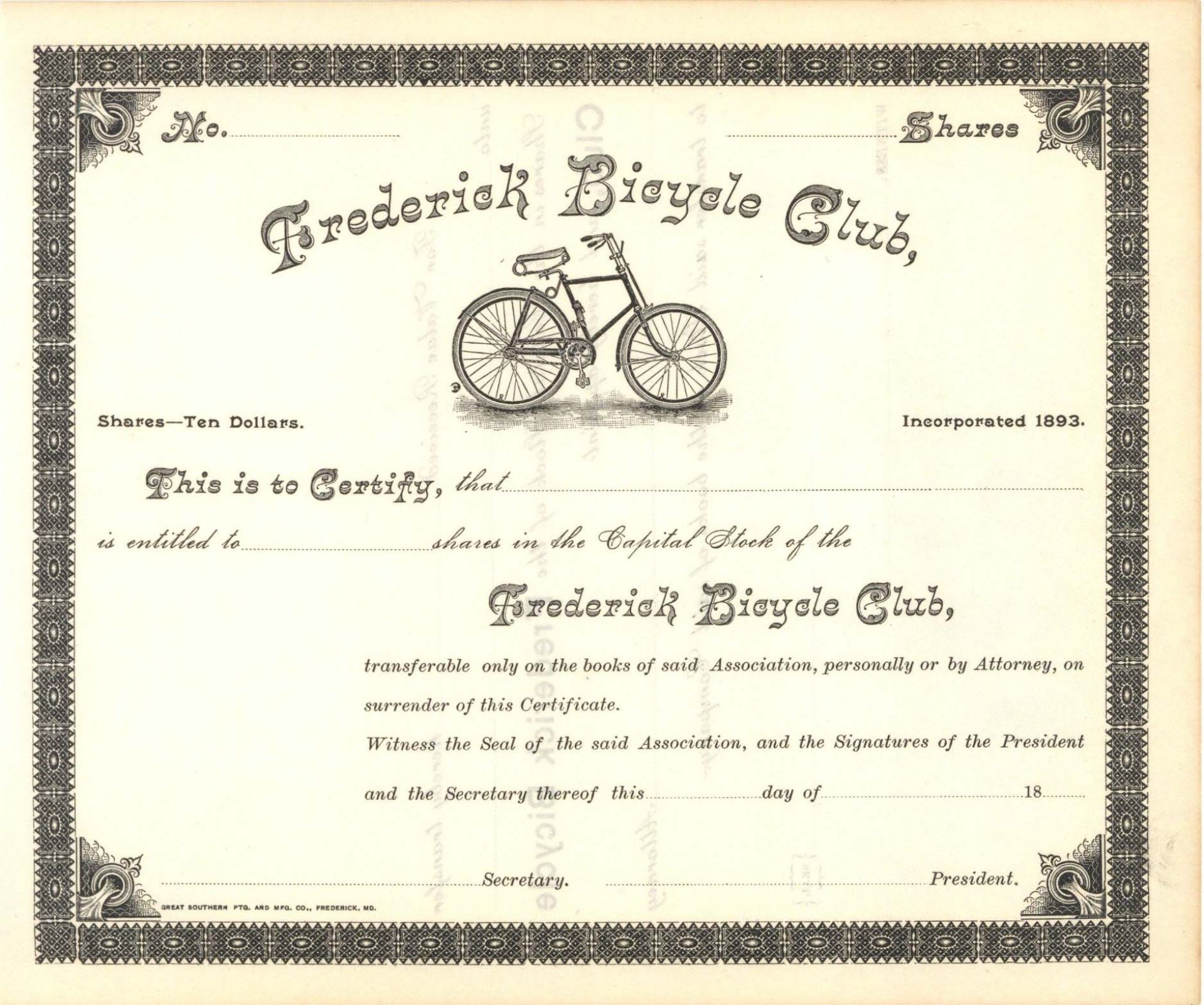 Unissued Stock printed by Great Southern Ptg. and Mfg. Co., Frederick, MD. Incorporated in 1893.