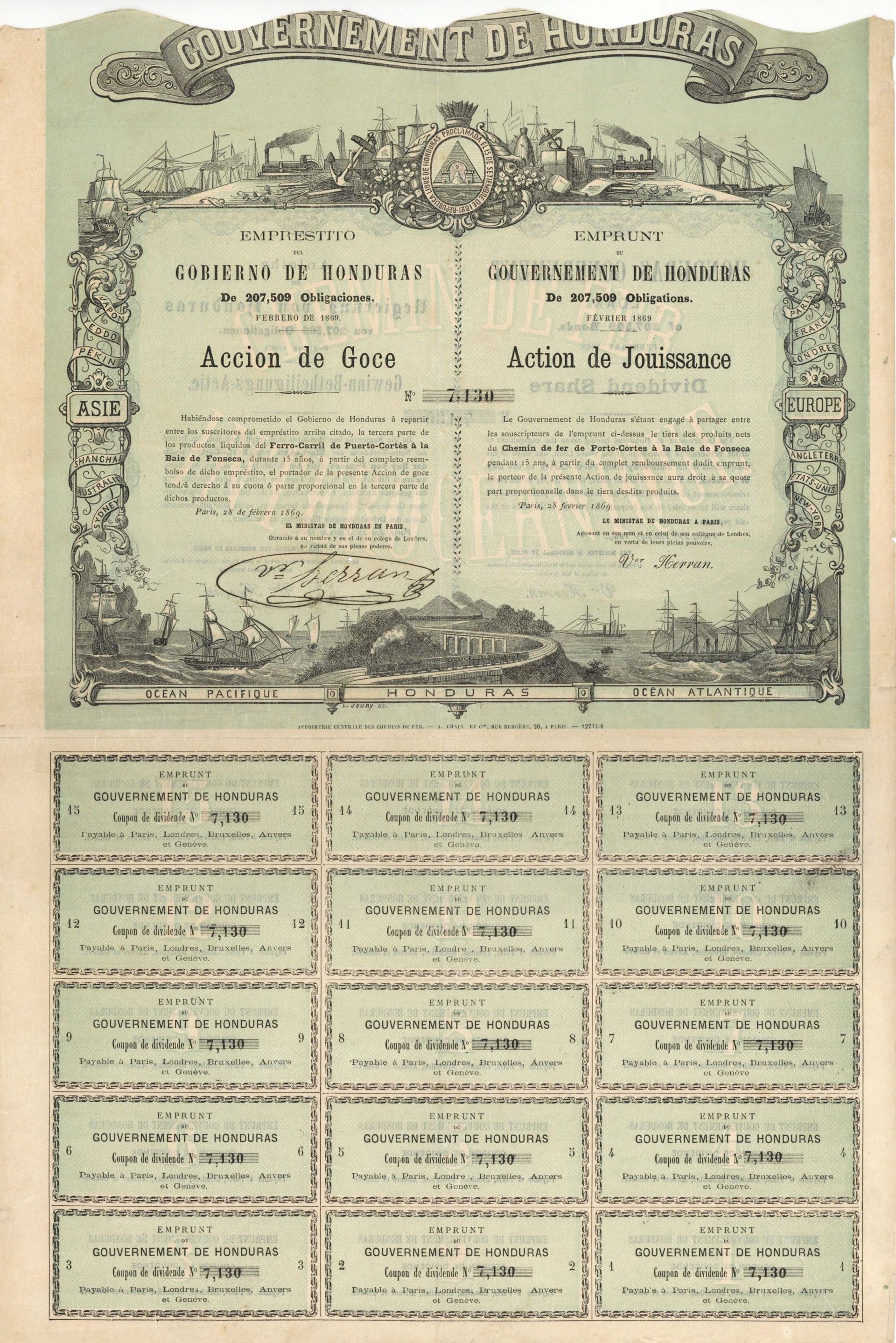 Gouvernement De Honduras - 1869 dated Stock Certificate