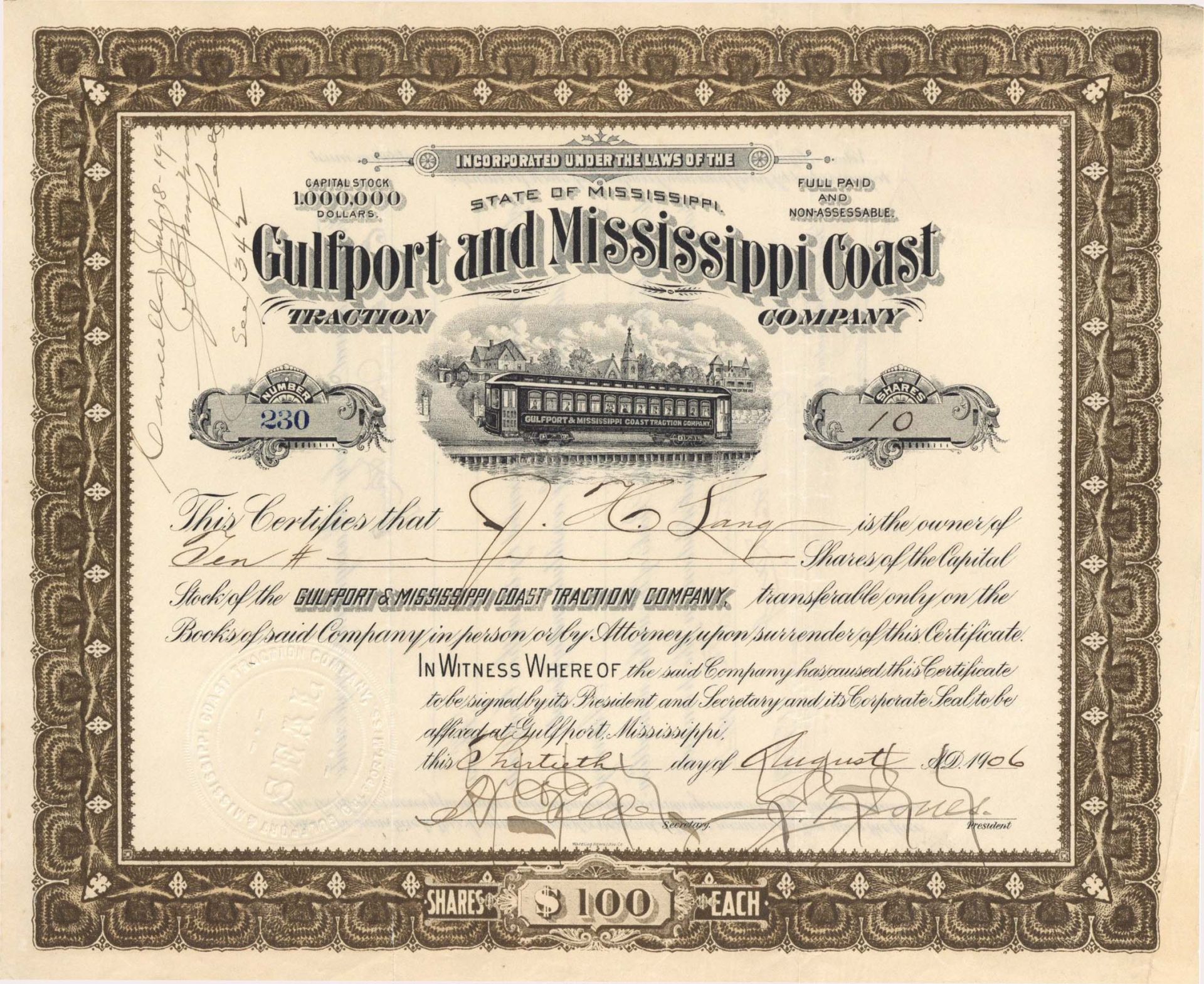 Gulfport and Mississippi Coast Traction Co - 1906 dated Railroad Stock Certificate