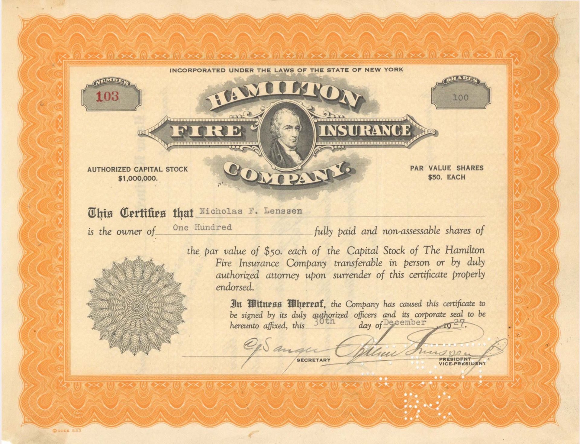Hamilton Fire Insurance Co. - 1927 dated Stock Certificate
