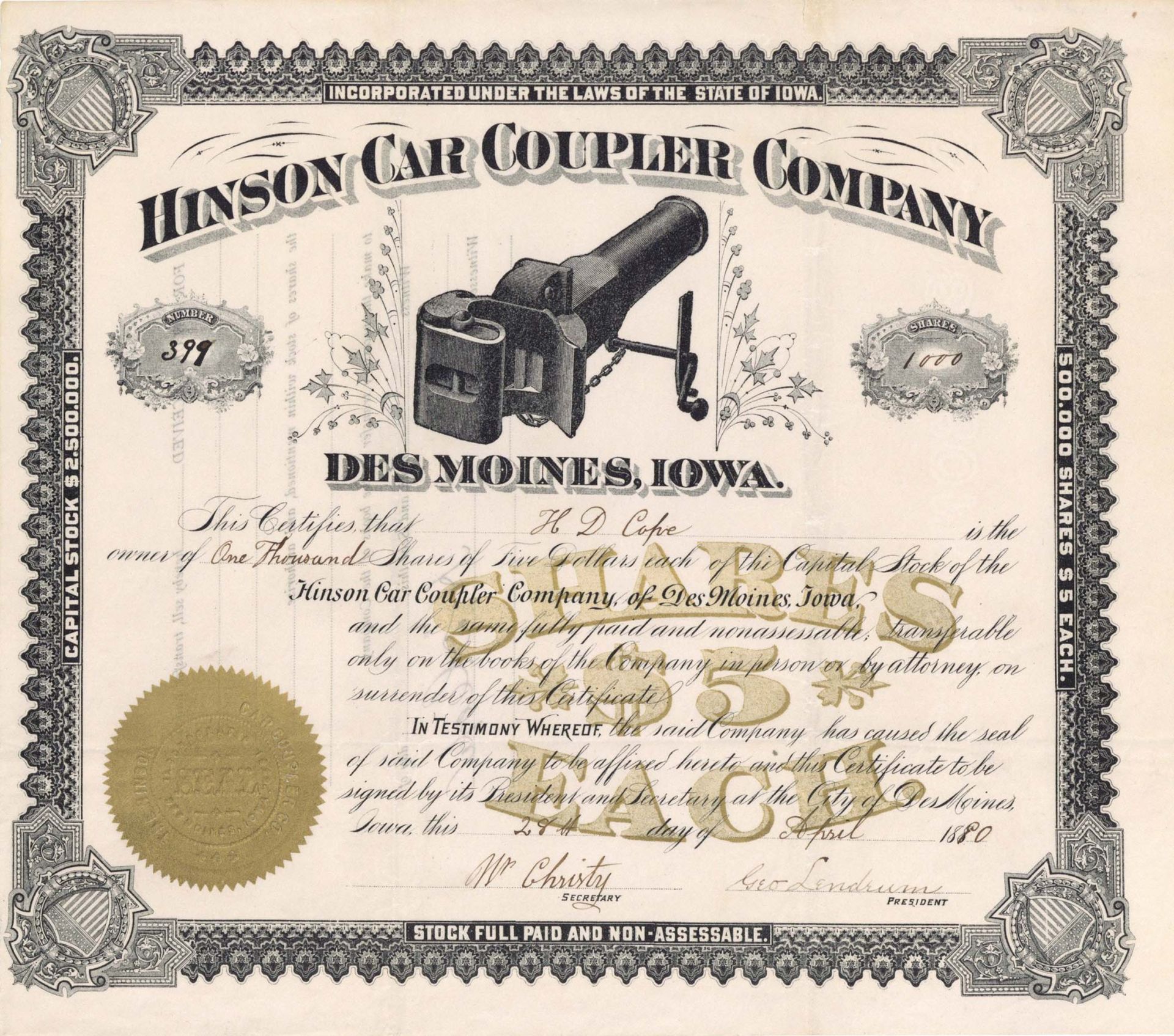 Stock with gold seal for 1,000 shares! Des Moines, Iowa.