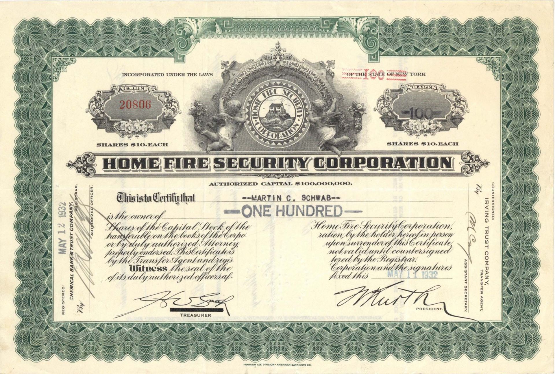 Home Fire Security Corp. - 1932 dated Stock Certificate