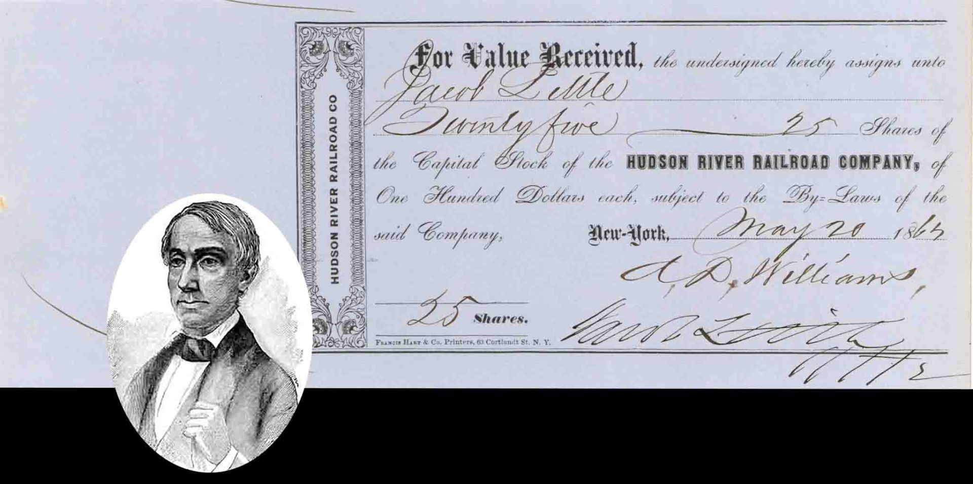 Hudson River Railroad Co. Issued to and Signed by Jacob Little - 1865 dated Autographed Stock Certificate