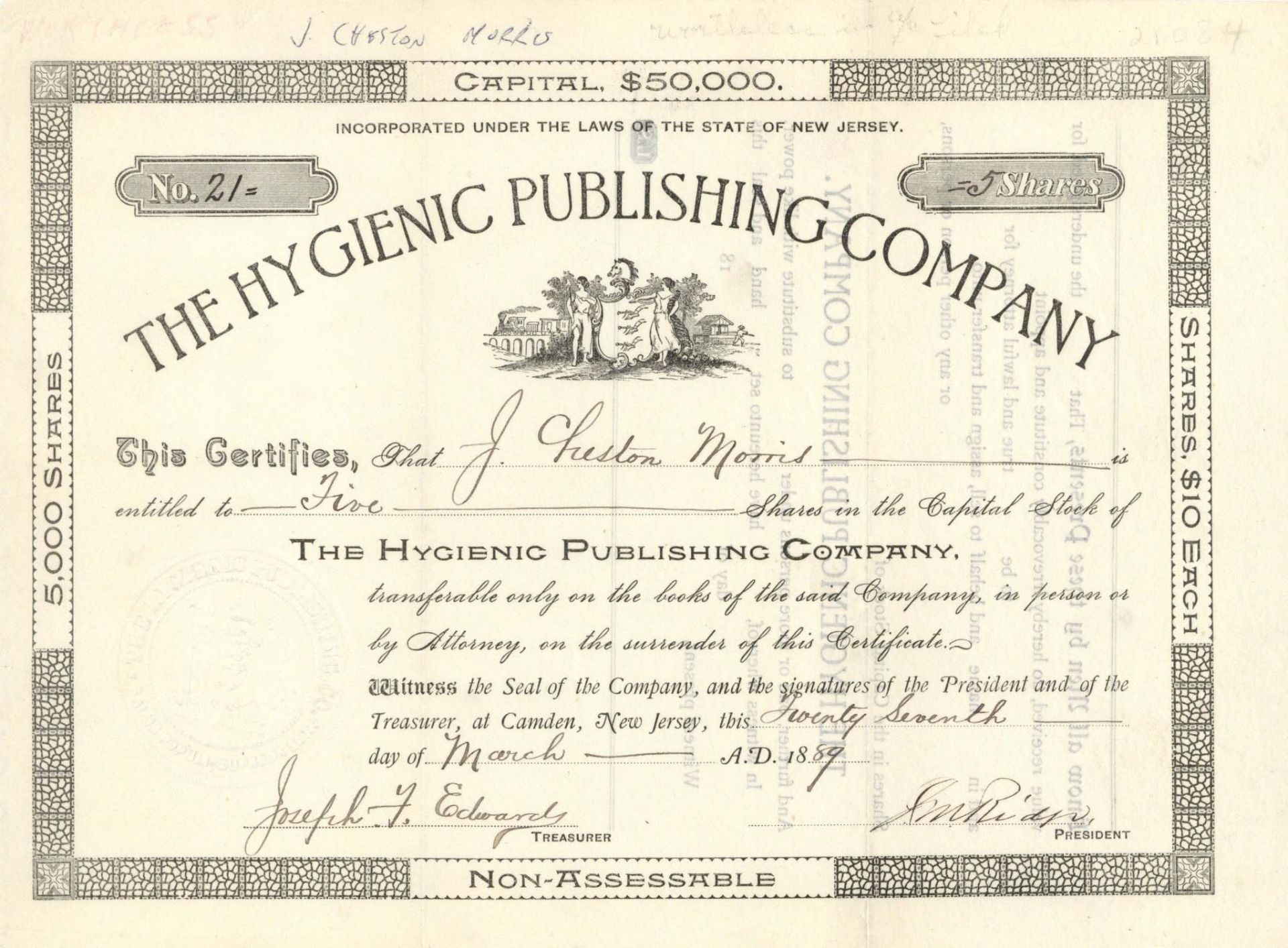 Hygienic Publishing Co. - 1889 dated Stock Certificate