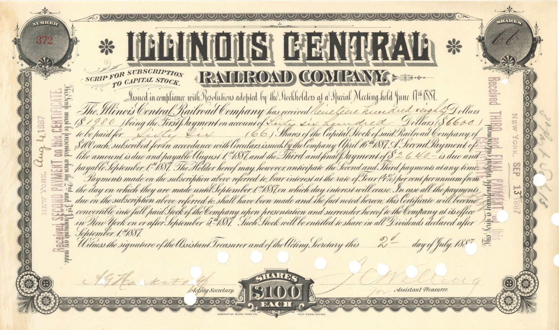 Illlinois Central Railroad Co. - 1887 dated Railroad Stock Certificate