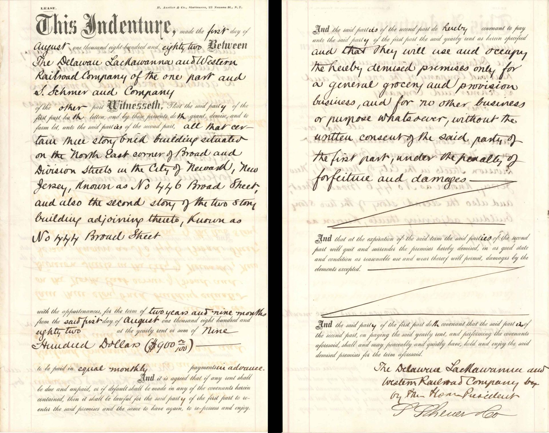 2 page Indenture between the Delaware, Lackawanna and Western Rail Road Company and S. Schmer and Company signed by Sam Sloan as president.