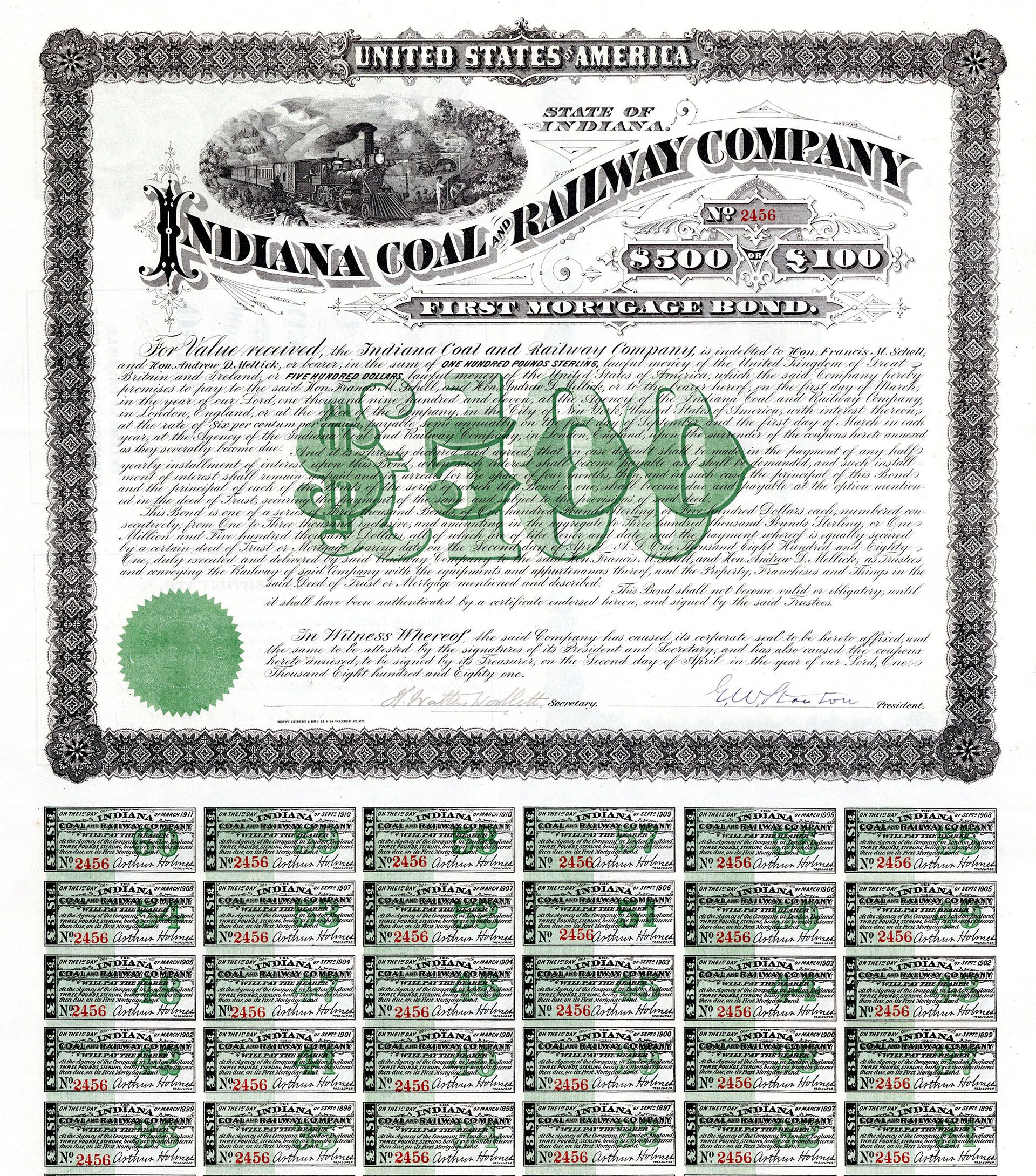 Indiana Coal and Railway Co. - $500 or £100 Bond (Uncanceled)