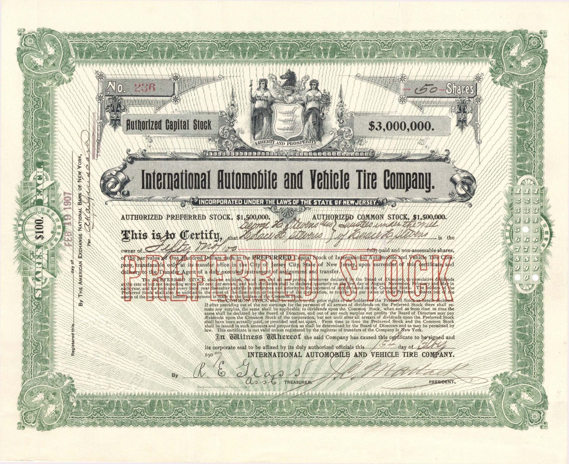 International Automobile and Vehicle Tire Co. - 1907 dated Stock Certificate