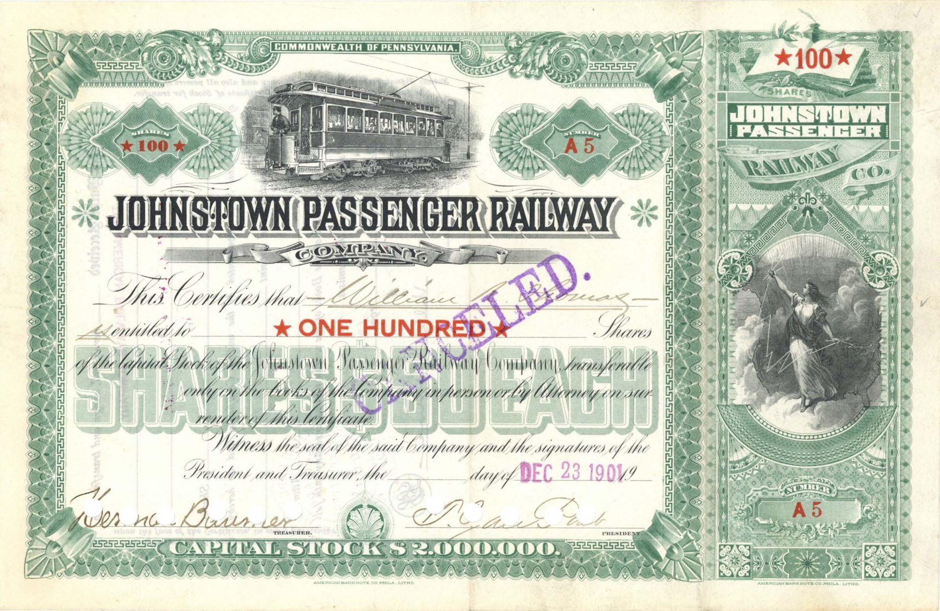 Johnstown Passenger Railway Co. - 1901 dated Pennsylvania Stock Certificate