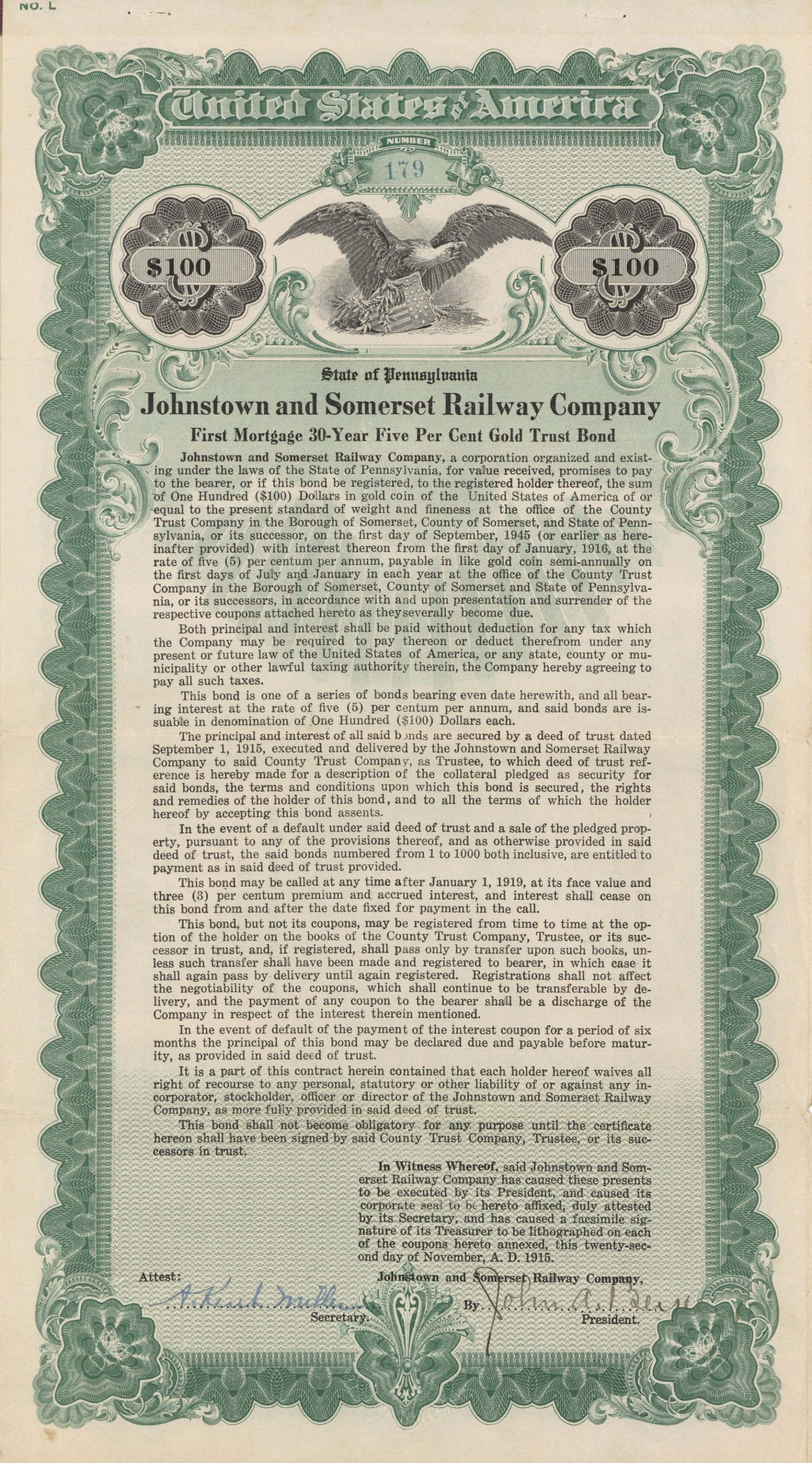 Johnstown and Somerset Railway Co. - 1915 dated $100 Railroad Gold Bond