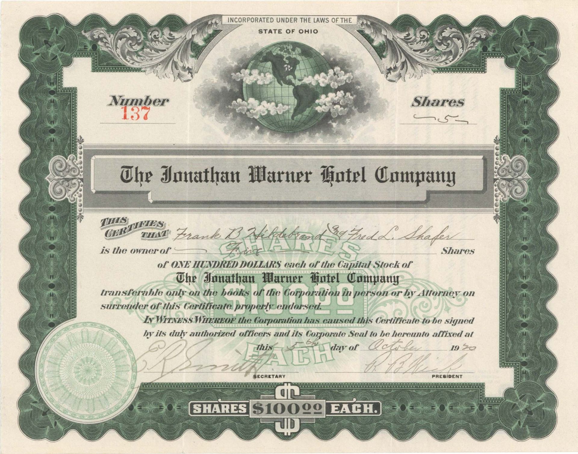 Jonathan Warner Hotel Co. - 1920 dated Stock Certificate
