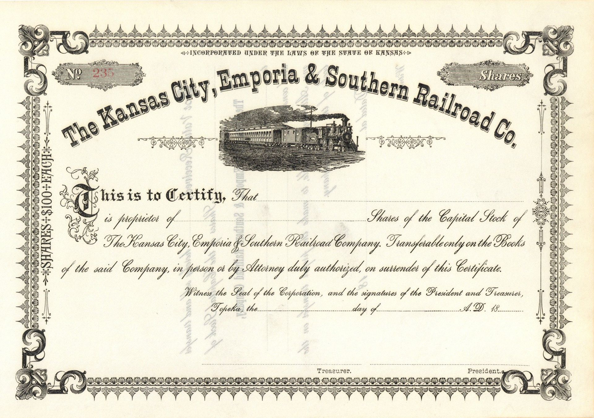 Kansas City, Emporia and Southern Railroad Co. - Stock Certificate - Branch Line of the Atchison Topeka Santa Fe Railway