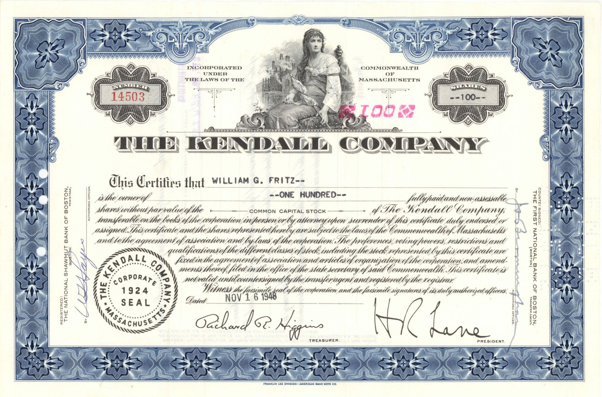 Stock printed by Franklin Lee Division-American Bank Note Co.